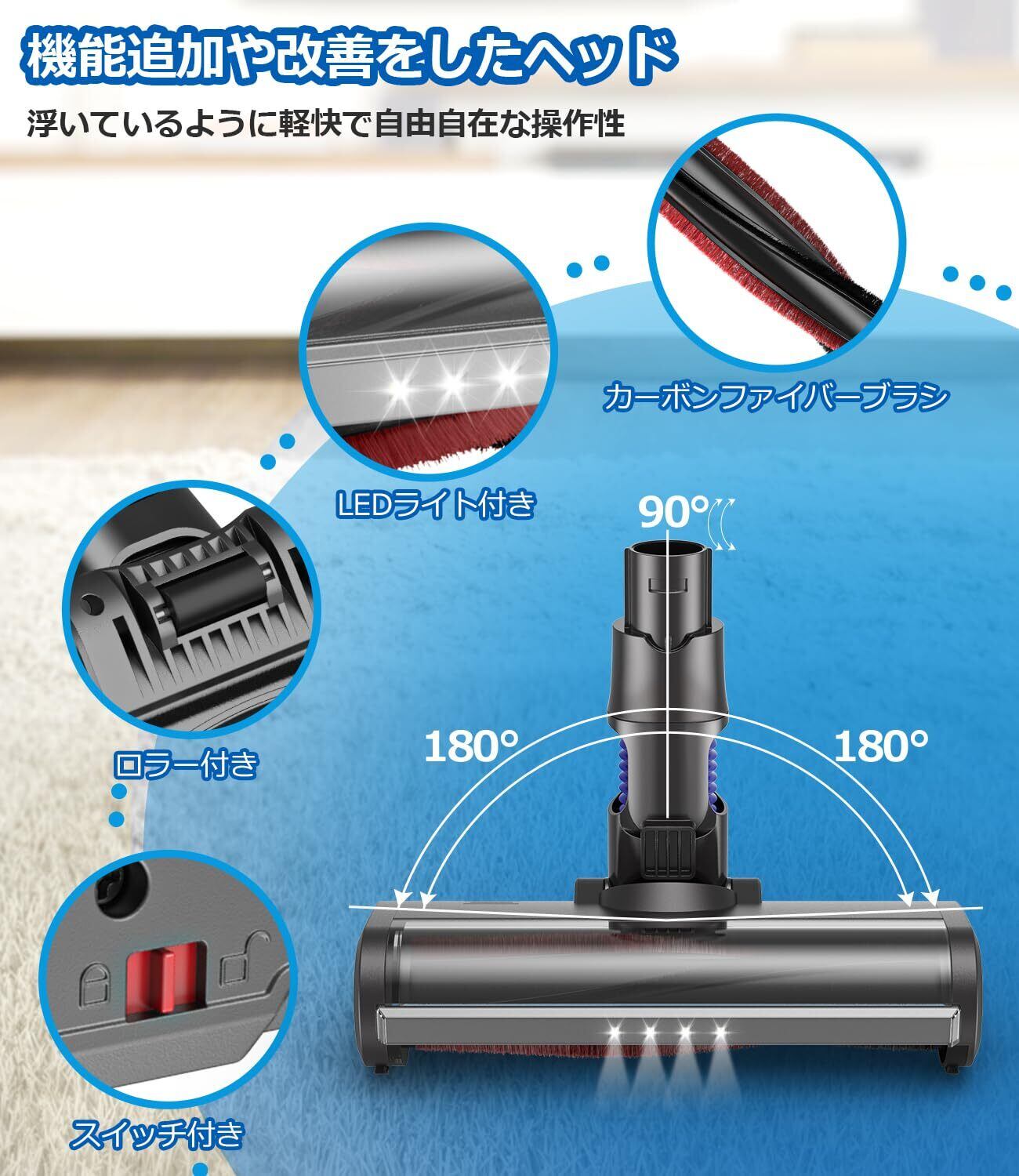 【カーペット向け掃除機 ヘッド】:掃除機ヘッドは、ナイロン製のブラシとカーボンファイバーブラシの組み合わせ。ナイロン製のブラシがカーペットの繊維の奥深くまで入り込み、ホコリや毛をかき出します。また、柔らかいカーボンファイバーブラシが静電気を抑え、繊維にくっついた細かいホコリまで掃除します。