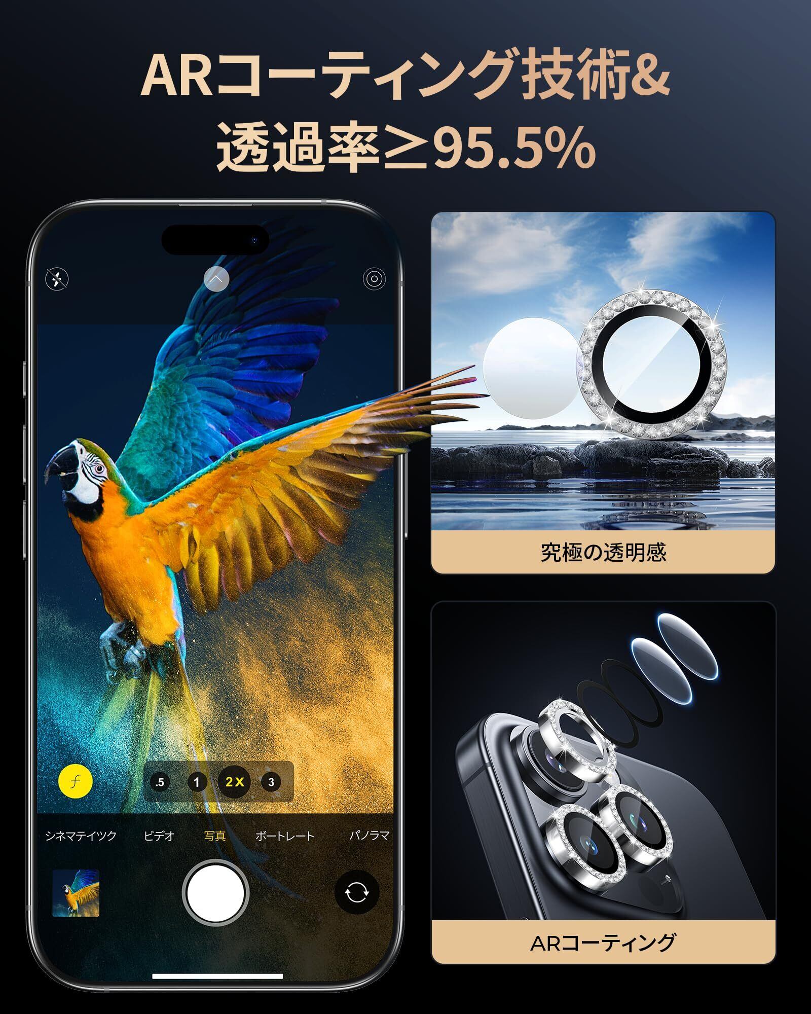 「埋め込まれた輝き」キラキラした輝きは、太陽や光の下でも衰えず、さらに一層輝きます。目を引く素敵なアクセントになりレンズを引き立てます。いPhone16Pro/いPhone16ProMaxに美しさと高級感を与えます。また、無駄なガラス部分を取り除くことで、市販のほとんどのケースと併用して、お気に入りのケースを好きなだけ選べる。