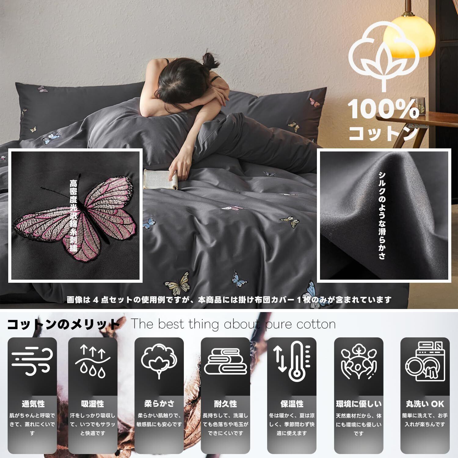 掛け布団カバー 長繊維綿100% 高級コットンサテン ピーチスキン加工 洗いざらし加工 光沢があり肌触りの良い刺繍 高密度生地300本 通気性・吸湿性・毛羽だちにくい シルクのような肌触り 高級で贅沢なホテルスタイル (ブラック, ダブル)