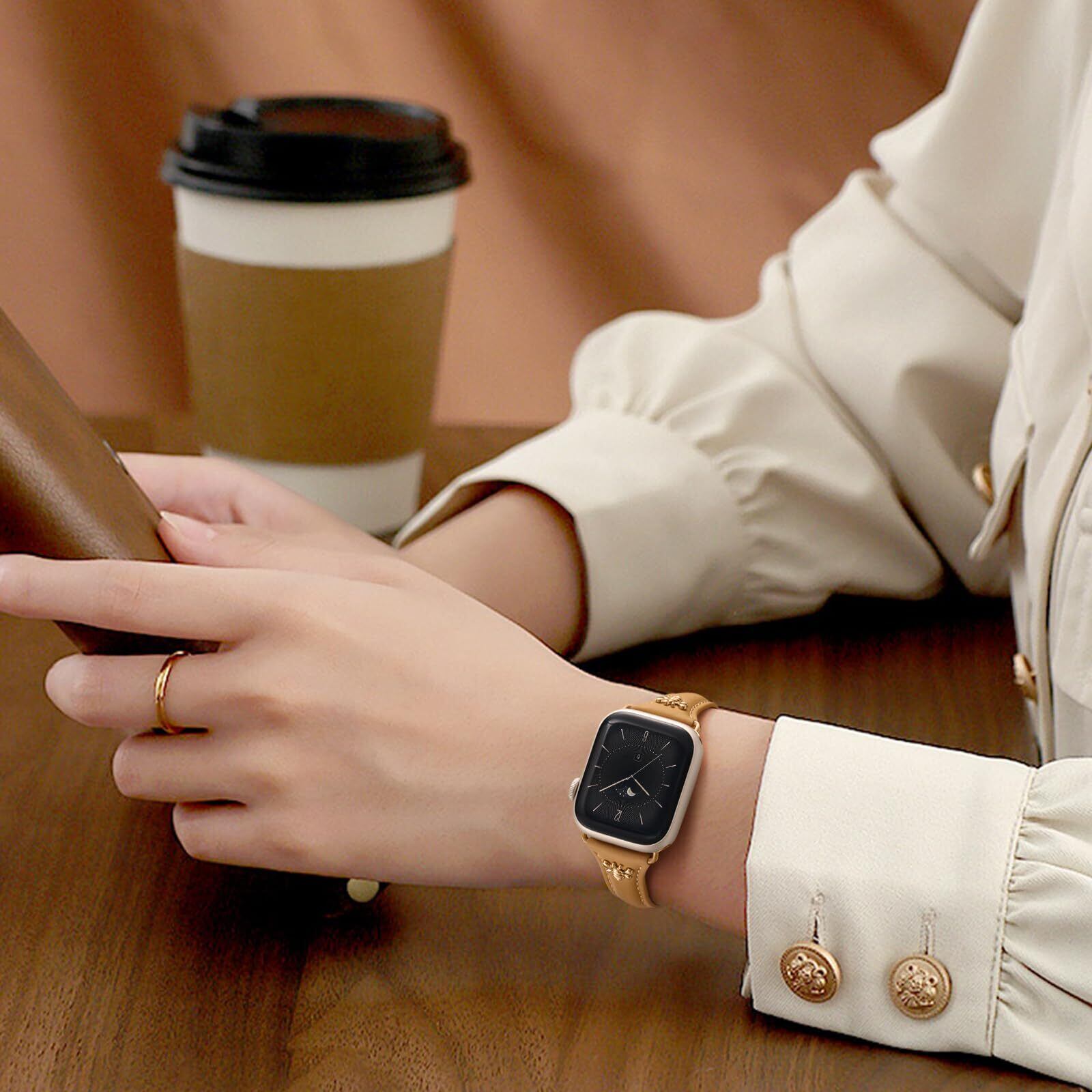 【独特なデザインとニュアンスカラー】本革を使用した本体に、2匹の蜂を組み合わせた飽きのこないデザインのアップルウォッチ用バンドは、誰でも手首にしっくりと馴染むスリムな仕上がりです。想像以上に肌に馴染むくすみカラーで、どんな服装とも相性が良く、仕事にもプライベートにもぴったりです。