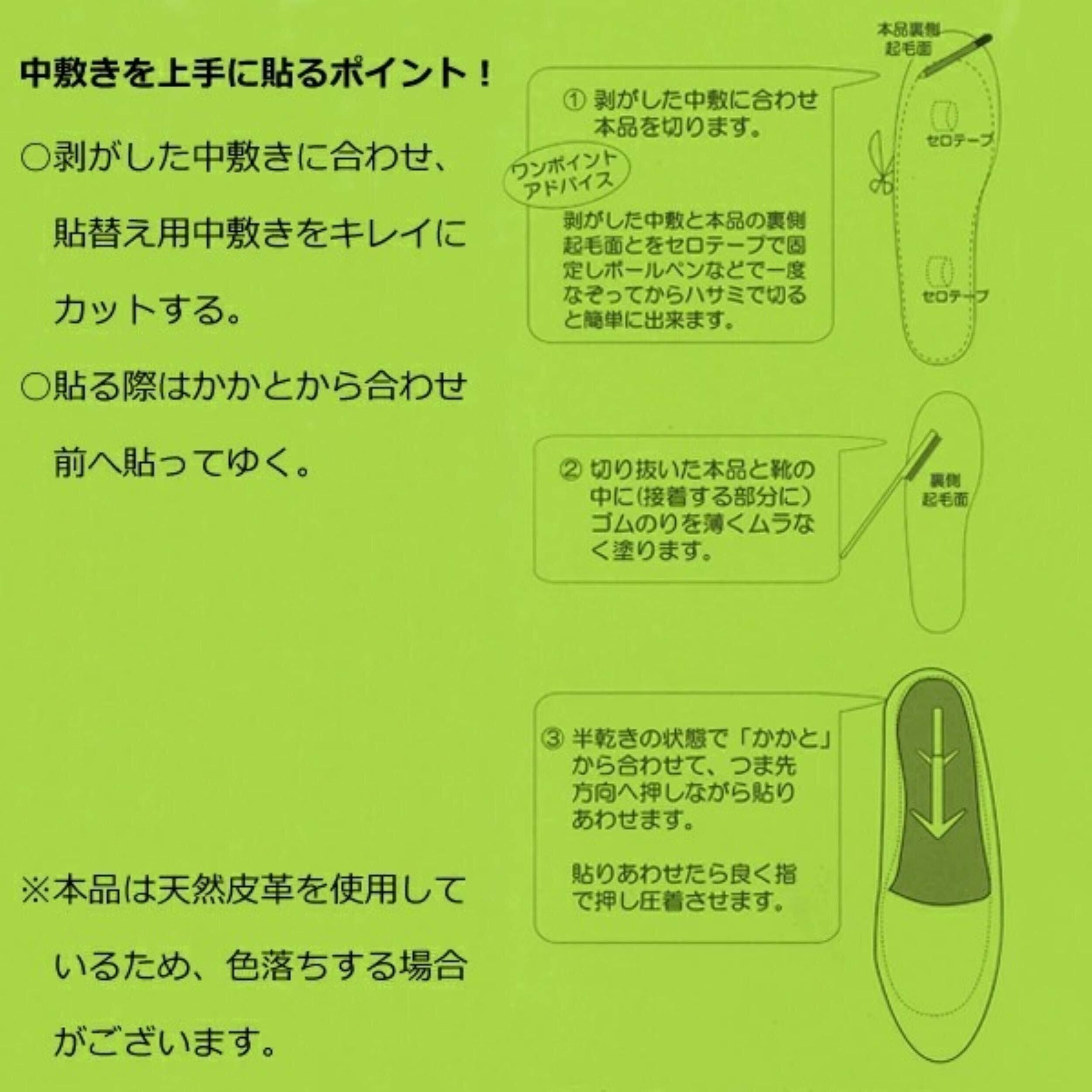 汚れた中敷きの貼り替えに! お気に入りの靴を簡単 リペア きれいに 修復 リフレッシュ。靴修理店で使用されている取替え用の革中敷です。中敷きが汚れてしまった靴を復活させるオススメアイテムです。靴の中敷を剥がし、大きさを合わせてボンドで張るだけで靴をリフレッシュできます。ソール自体が1mmと薄いので気にならないようなら、そのまま貼り付けもOK。ボンドのほうが確実ですが、両面テープでも可。