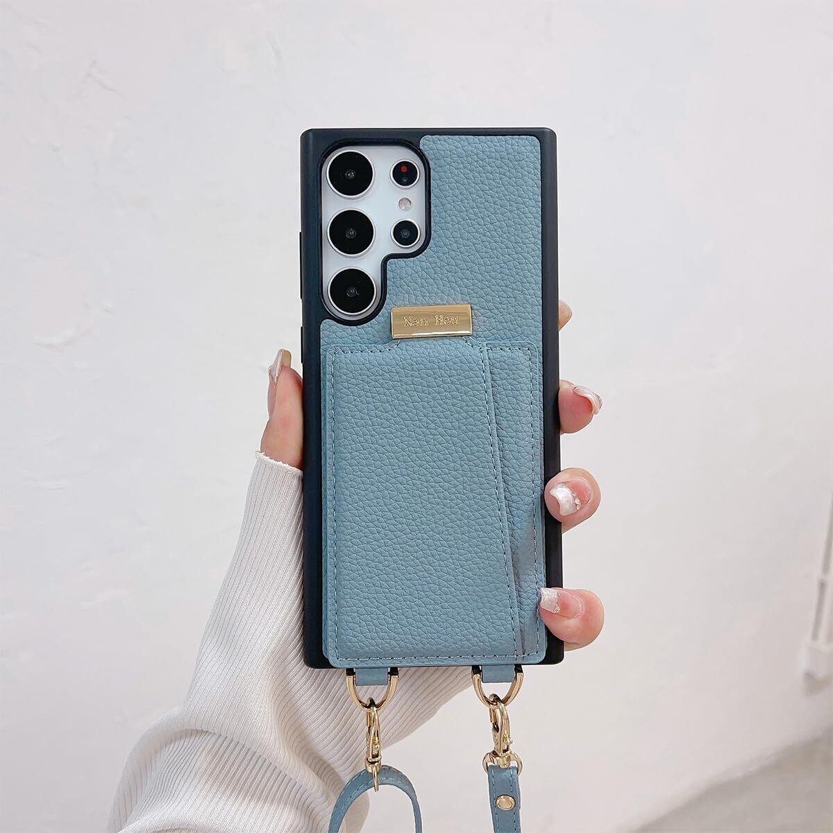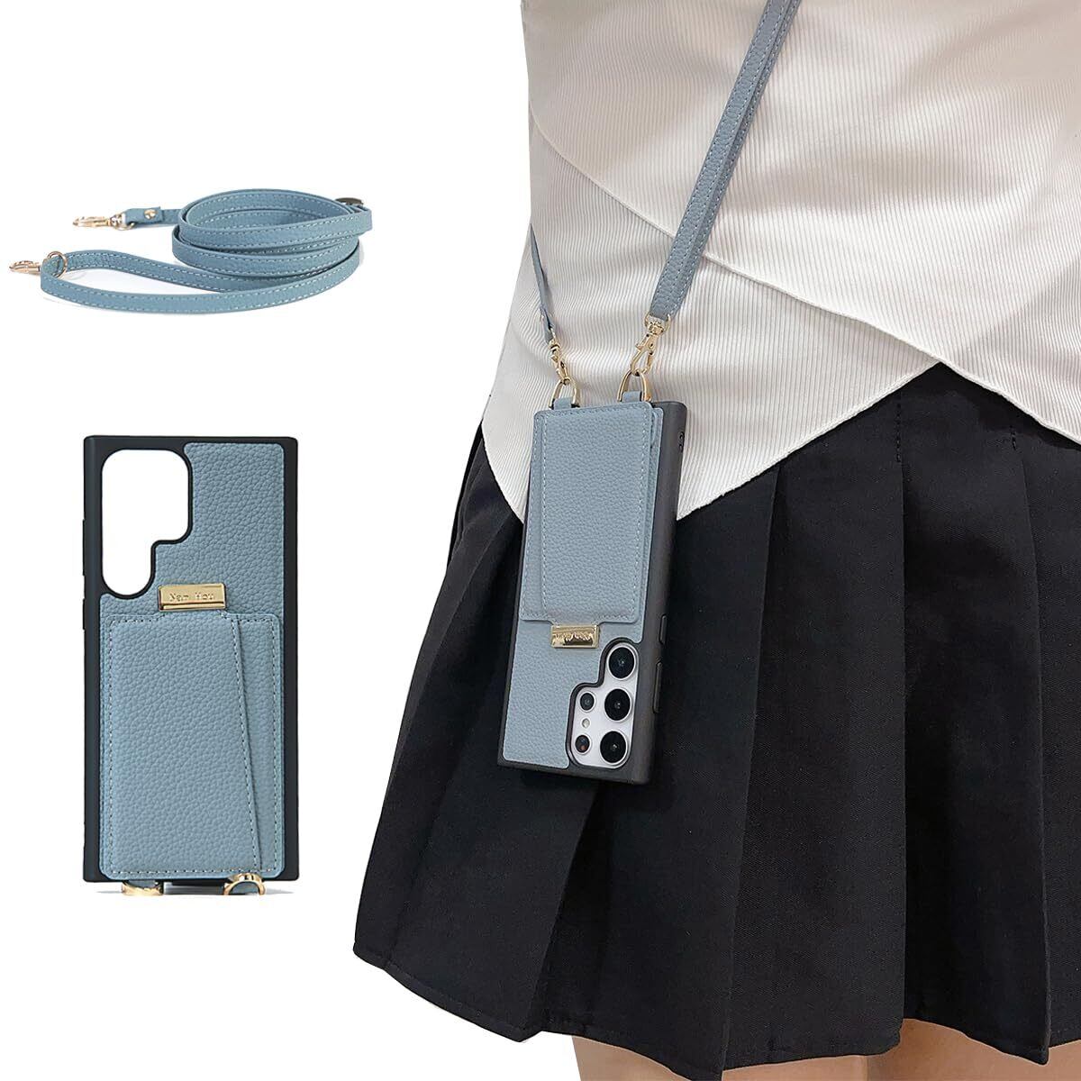 Samsung Galaxy S24 Ultra ケース 手帳型 高質PU ファッション SC-52E SCG26 手帳型 斜めショルダーストラップ付き(長さ調整可能)耐衝撃 保護 カバー 内蔵 自吸式開閉 マグネット 背面鏡付き 人気 携帯 SC-52E カバー 女性 上品 カードポケット スタンド機能 SCG26 ケース - リンネルブルー