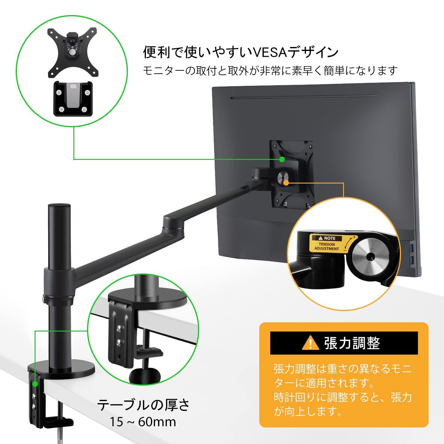【角度高度調整可能】モニターは自由に360度回転して最も快適な位置に簡単に調整できます。モニターのアームは145度の傾斜することができます。最大延長は52cm、最大高度は43cmになります。ご使用目的によって、モニタースタンドをラップトップスタンドに変更することもできます。