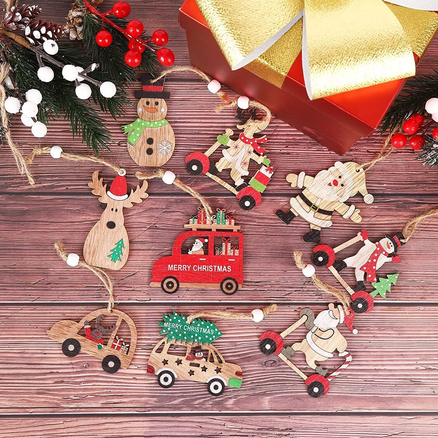 【パッケージ】クリスマスツリーオーナメントはサンタクロース、トナカイ、雪だるま、クリスマスツリーなどのデザインが3種があり、各デザインのオーナメントは3個入り、合計9個があります。オーナメントによって、それぞれのサイズが違います。各オーナメントは約5cm~9cmぐらいです。適切なサイズでクリスマスオーナメントをより人目を引きます。 ミニ飾りパーツの上部に通し穴が付けて、麻紐付きの木片をクリスマスツリーに掛けて、暖かい雰囲気を演出します。