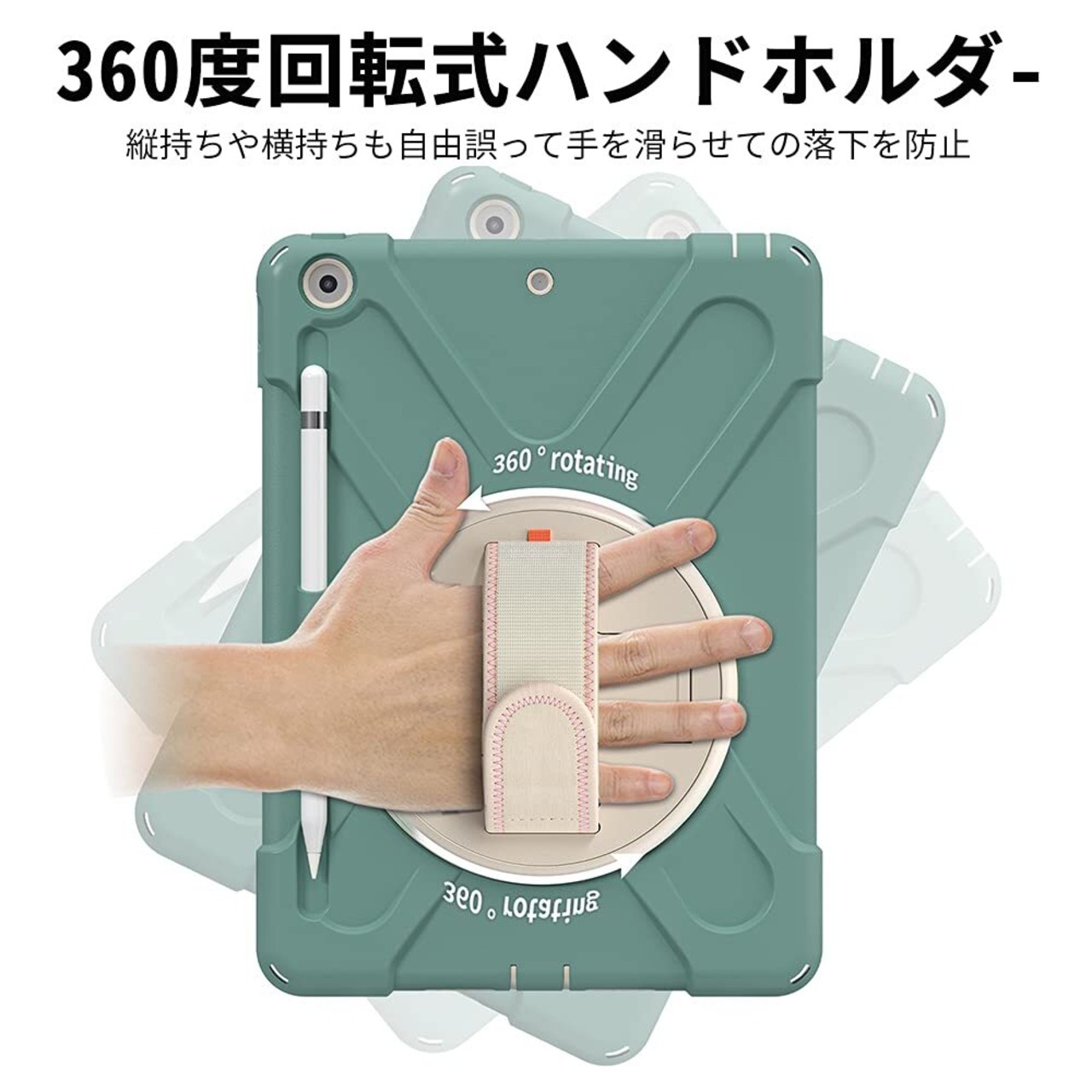 iPad 9世代 ケース-【スタンドとハンドホルダー】:360度回転&段階調節可能スタンドによって、動画視聴やゲーム、仕事などの作業が楽に行えるようになりました。ハンドホルダーを使用しながら操作する事により、落下の危険を軽減する事が出来ます。