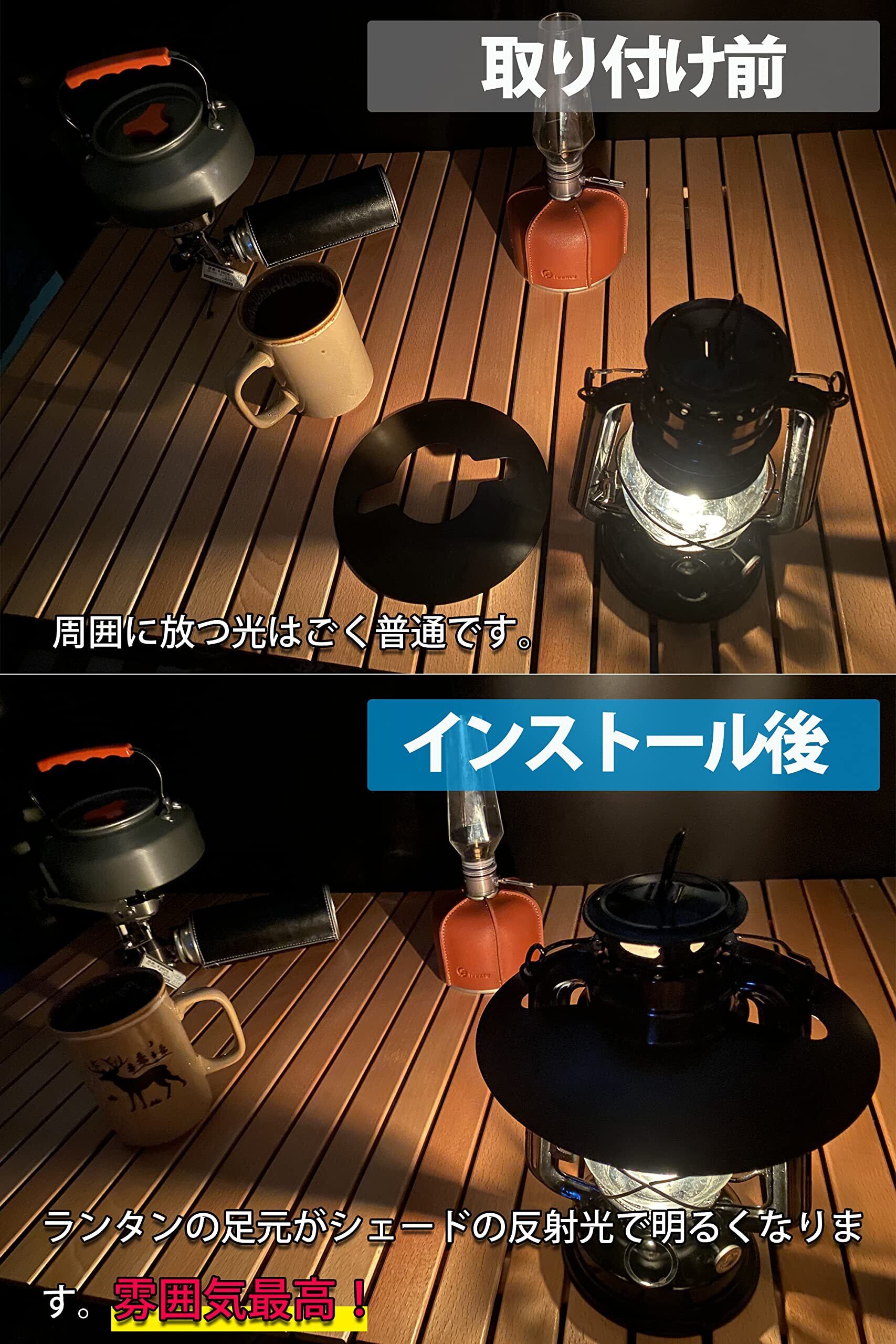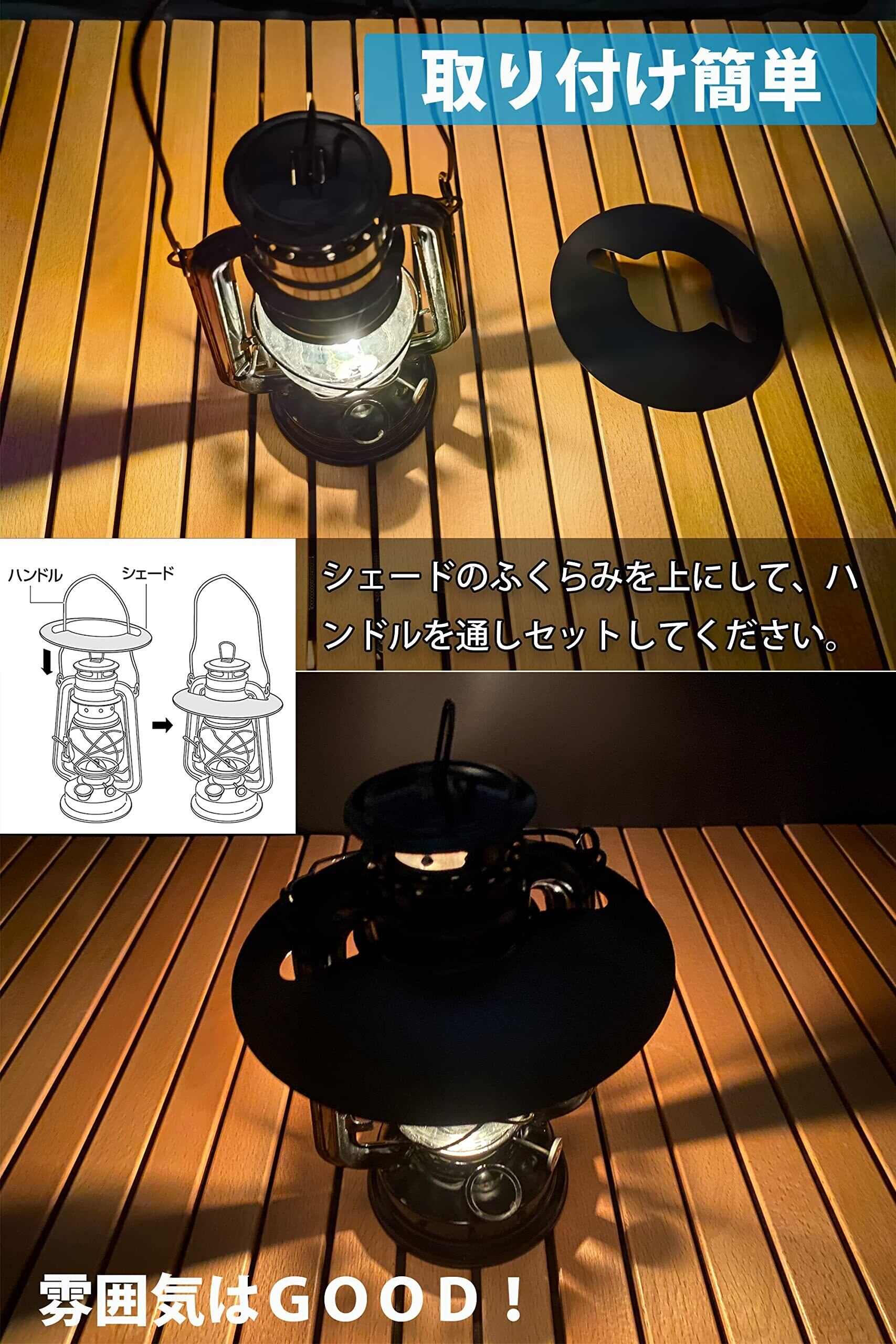 ピッタリシェードのふくらみを上にして、ハンドルを通しセットしてください。ランタンと同じ色で上面を塗装しました。装着すると雰囲気がガラッと変わります。鉄製軽量でエッジ面取りもしてあり製品仕上げは良いです。