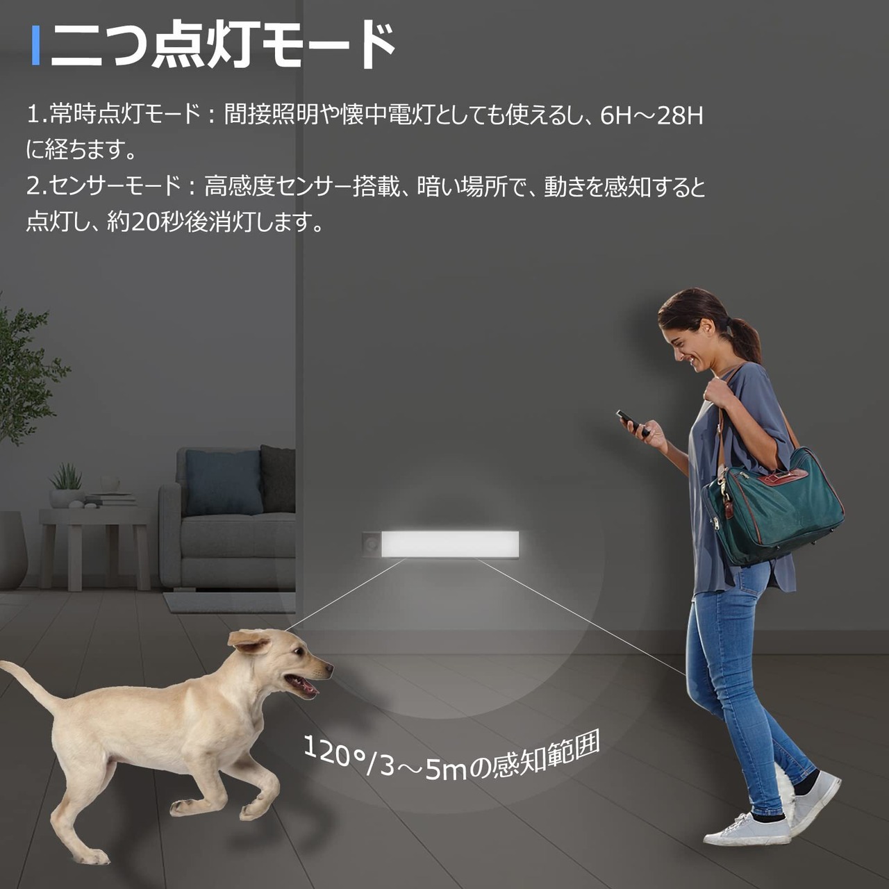 【ワンボタン操作●2つモードに切り替え可能】 ①常時点灯モード:一回ボタンを押して常夜灯として使える。明かりの強さも無段階調光ができます。②明暗・人感センサーモード:暗い環境で最大120°、3メートル以内の動体検知することでライトが迅速に点灯し、約20秒後動体が検知されない場合は自動に消灯します。ご注意:明るい環境ではセンサーの動作を停止することになります。