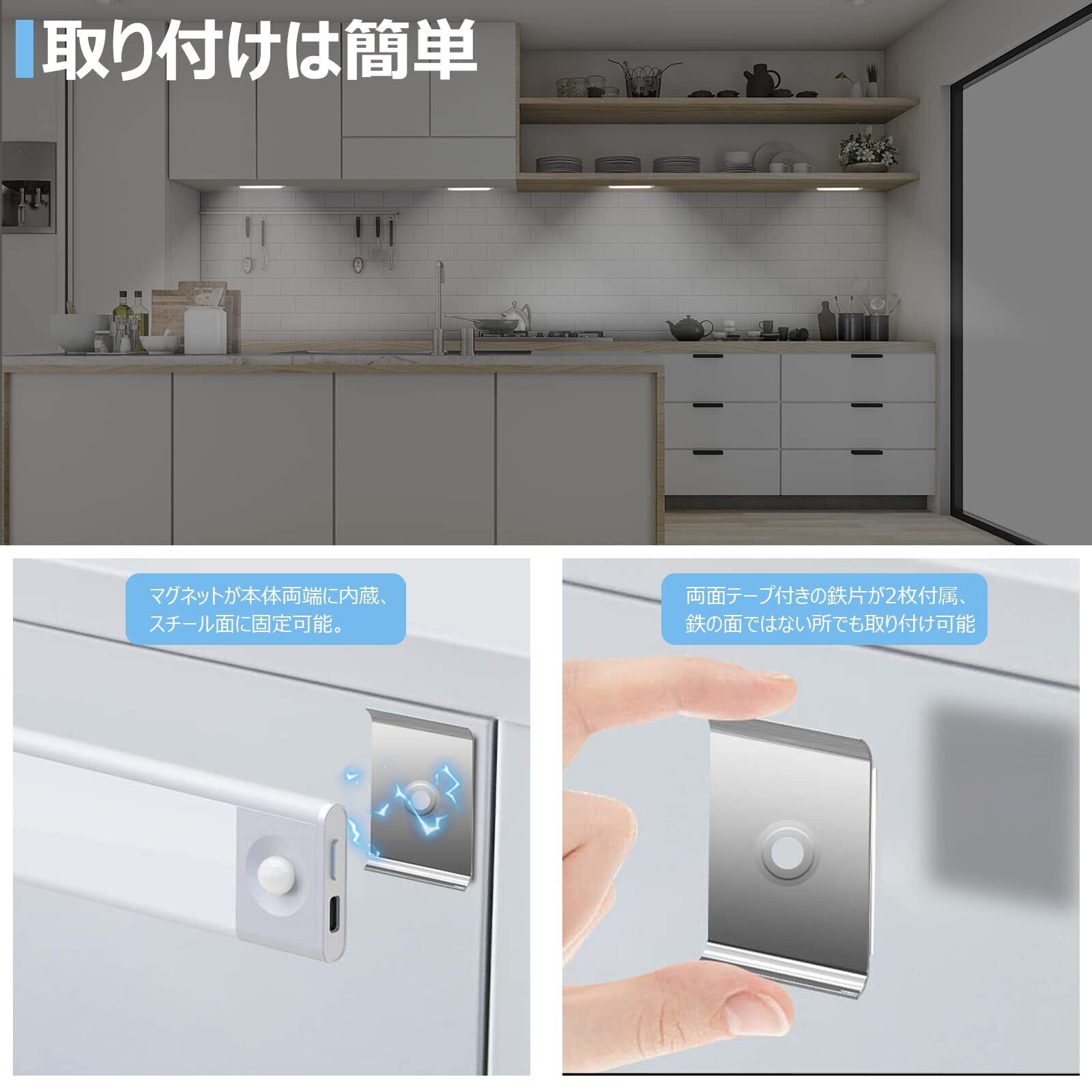 【工事不要・取付簡単】センサーライト本体の両端では強力マグネットが付いた為、ツール不要で鉄面に簡単に取り付け出来ます。いつでも外して手を握りながら緊急時の懐中電灯としても使用可能です。 【幅広い互換性・便利】粘度の高い2枚の両面テープが付いた為、お手軽に階段・寝室・廊下・玄関・キッチンなど取り付けたい場所に貼り付けできます。より安定・便利且つ経済的で取付も非常に簡単なセンサーライトです。