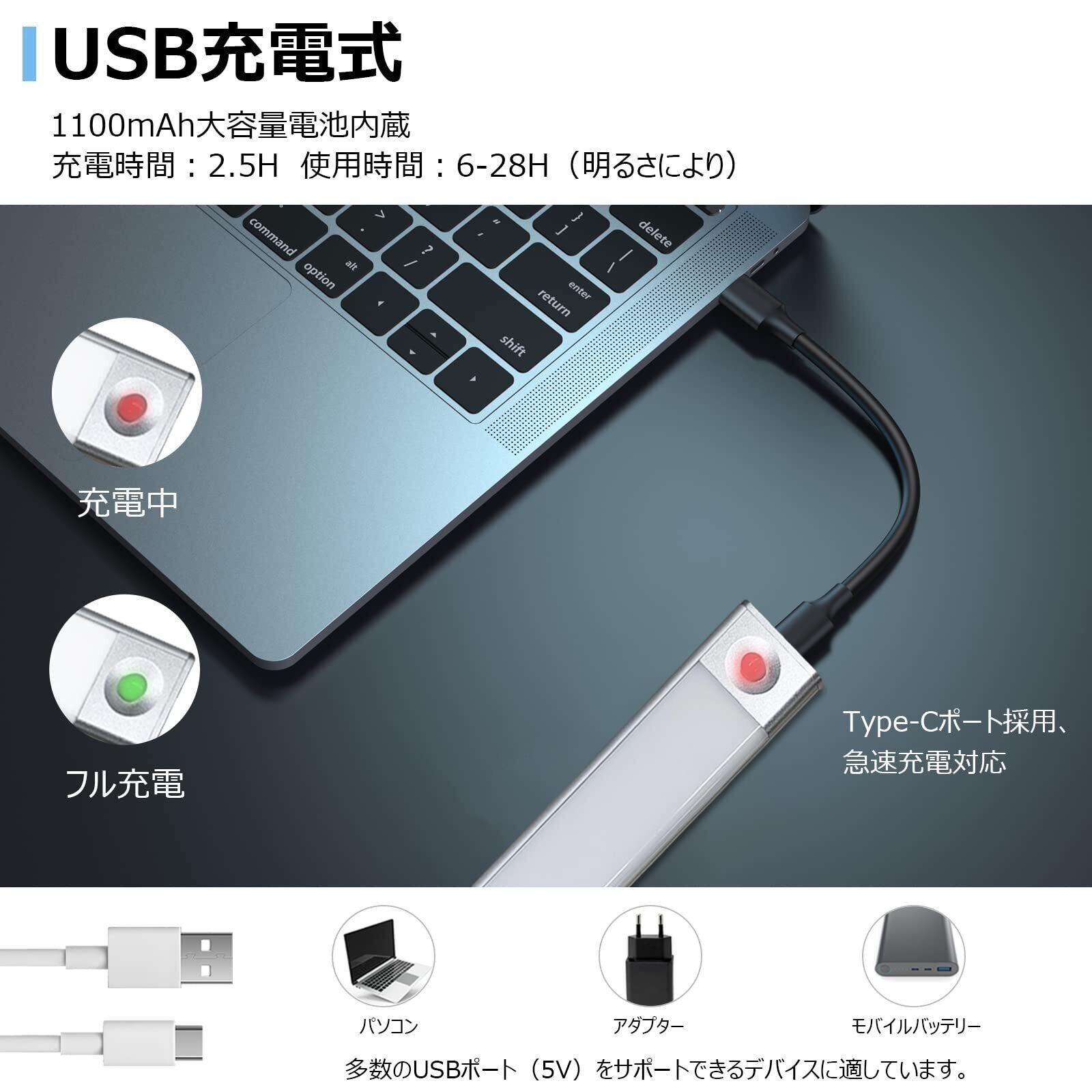 【大容量電池&USB充電】大容量の電池を搭載しており、USBケーブルで充電でき、電池交換の面倒もない。1回のフル充電で約6-28時間の連続点灯が可能です。ご注意:明るさと点灯モードにより使用時間が違います。【省エネ・小型】23*4*0.88cmの小型のライト本体はとても軽量で、狭い隙間にも使える省スペース設計です。思ったより小さい声もありますので、注文する前にサイズをご確認ください。