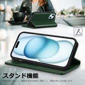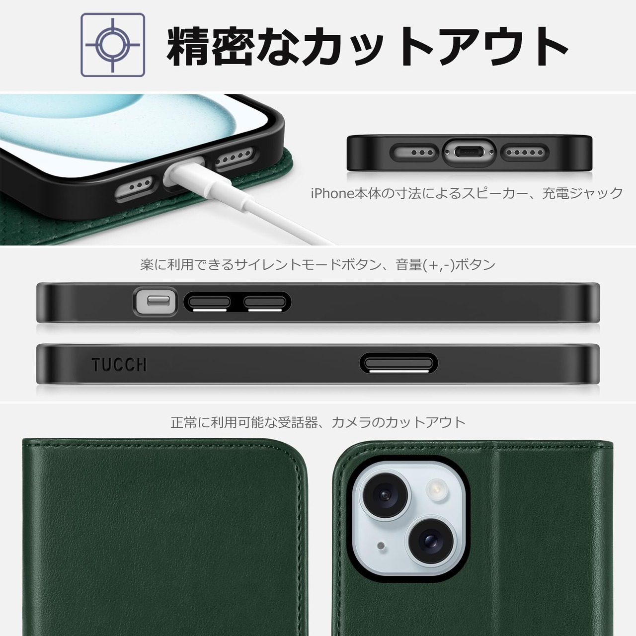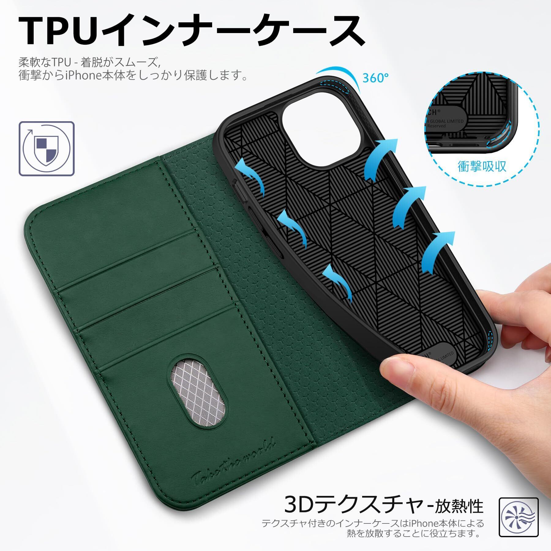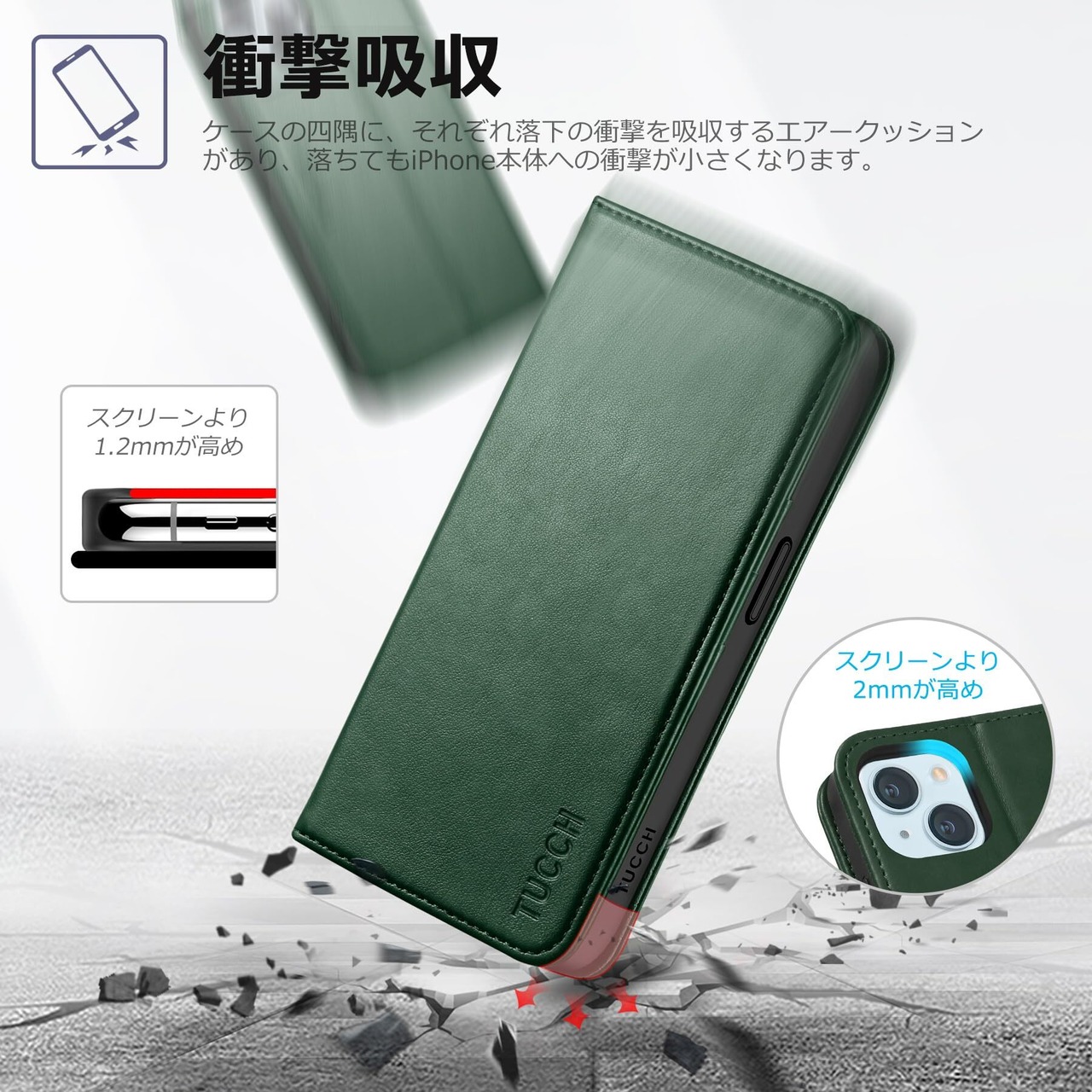 TUCCH iPhone 15 用 ケース 手帳型 アイフォン15 カバー カード収納 横置きスタンド機能 高級PU合皮 TPU素材 全面保護 衝撃吸収 [RFIDブロッキング] アイフォン15 財布型 (2023年発売 iPhone 15 6.1インチ 対応) グリーン