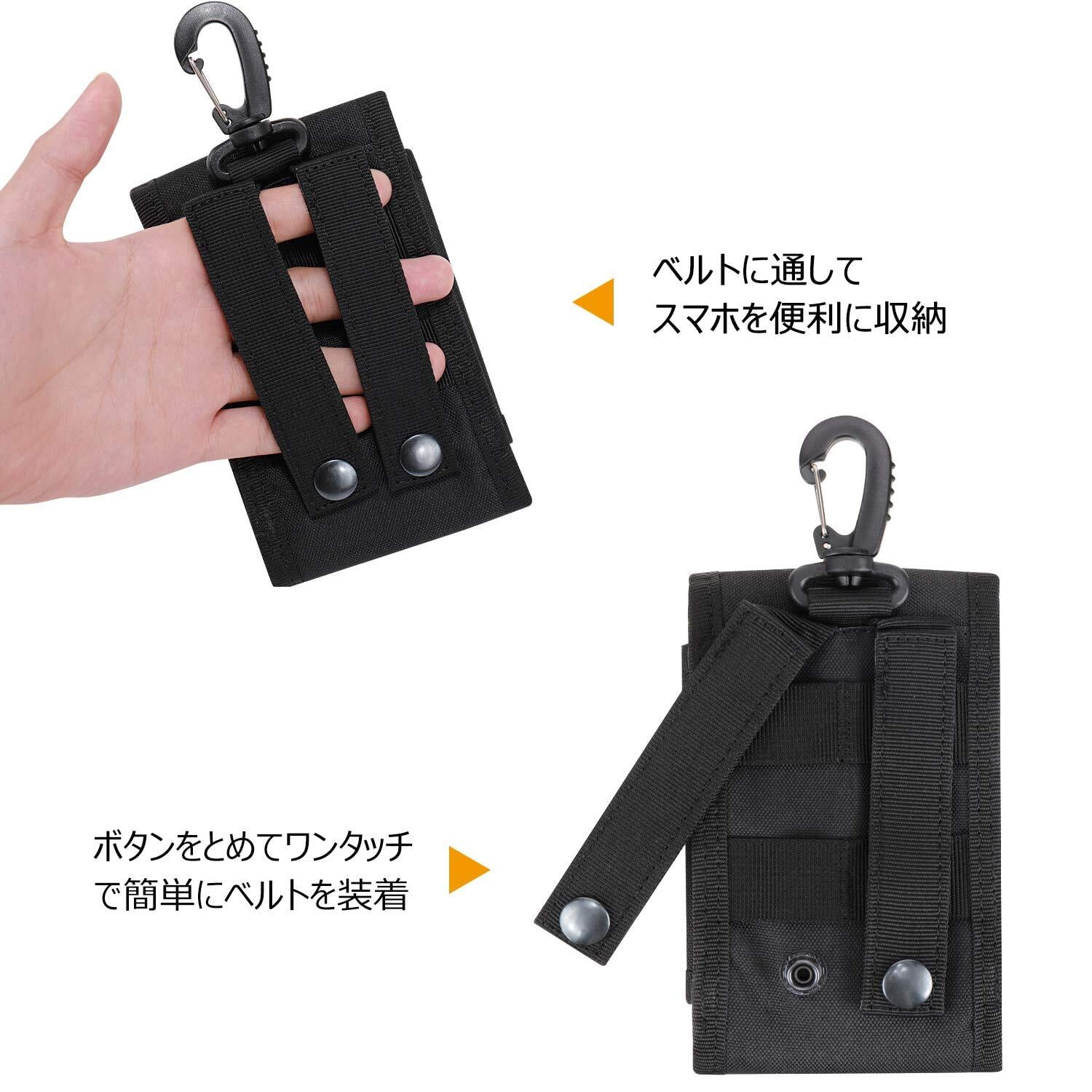 仕様:人気ブランド「JISONCASE」の汎用スマホポーチ。留め具は強力的な紐仕様、サイドは伸縮性があるデザインのおかげで、ケース装着 6.0インチ以内のスマホあるいはほかのサイズ同じぐらいデジタルカメラなどの小物も何でも収納できます。背面にベルトストラップ付きで、Molleモール対応したベルト、ベストに取り付けることができます。