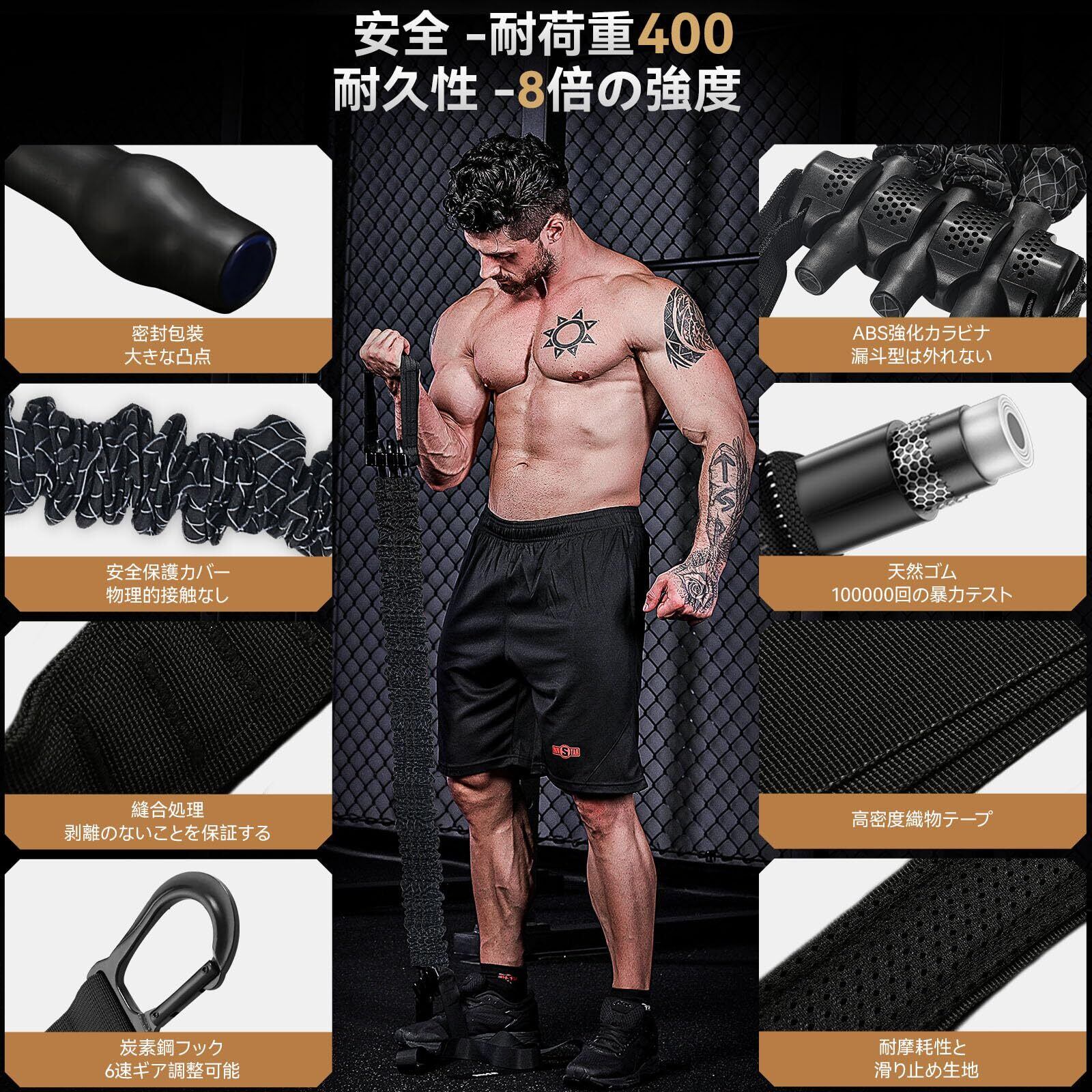 【調節可能な伸縮性】3つのプラグイン抵抗バンドと安全フックを30秒以内に取り付けることができます。弾性ロープを外してベルトの長さを調整することで弾性(25kg / 50kg / 75kg)を調整でき、最大ベアリング重力は360キャティです。