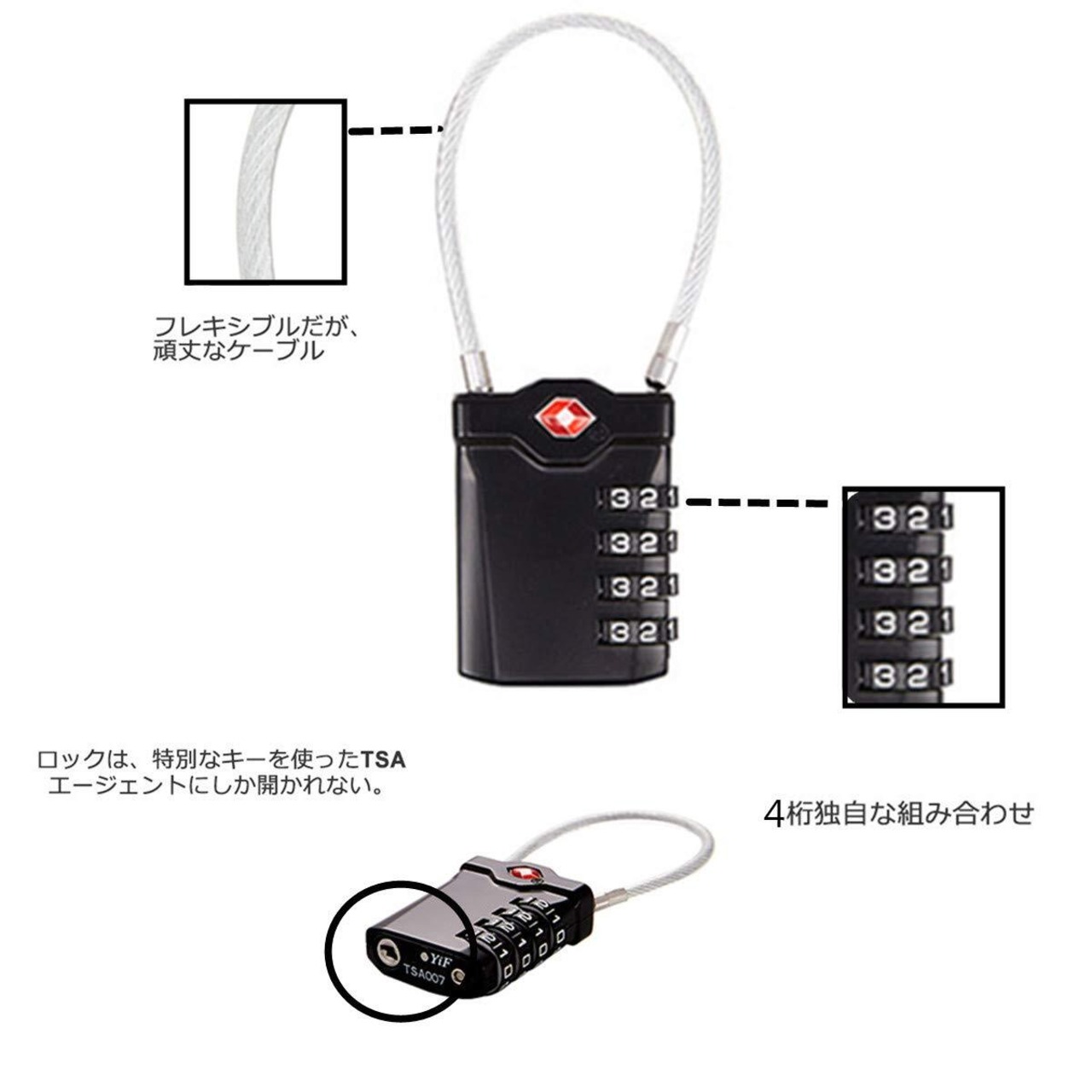 TSA承認済み:アメリカ運輸保安局 TSAによって認可・容認された製品です。施錠をしたままでも荷物を預ける事ができます。アメリカ、イギリスへの旅行などにも安心です。