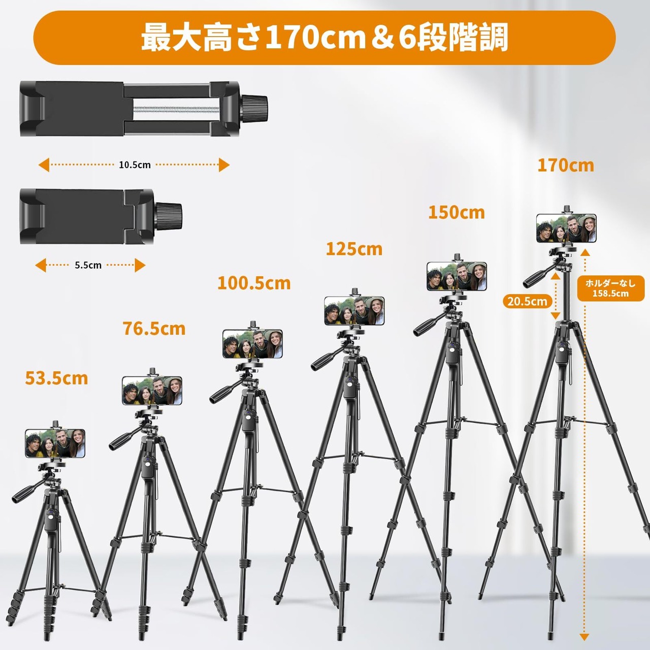 軽量&6段階調整:アルミニウム合金製で、頑丈の上に重量はたった0.8kg。高さは45cmから170cmの高い位置まで5段階調整できます。