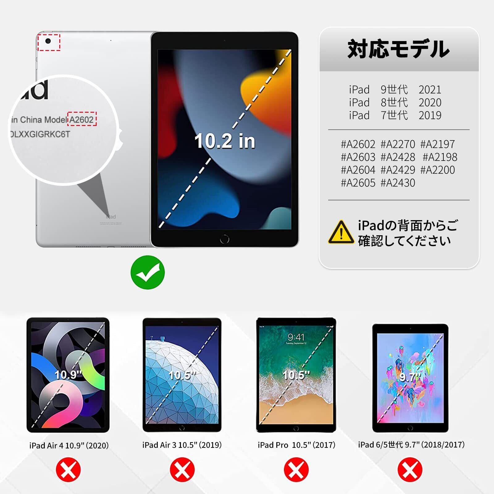 【対応モデル】iPad 9/8/7 [2021/2020/2019]専用(モデル番号:A2197、A2198、A2200、A2270、A2428、A2429、A2430、A2602、A2603、A2604、A2605)対応の保護ケースです。ご注文する前、モデル番号をiPadの背面からご確認してください。