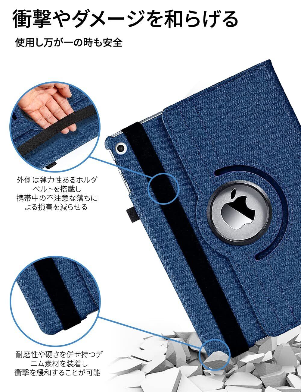 iPad 9世代 ケース 10.2インチ iPad 第9/8/7世代 ケース (2021/2020/2019モデル) 360度回転 耐衝撃カバー オートスリップ機能搭載 3段階調節可能 ホルダベルト付き Apple pencil収納可能 デニム (紺色)