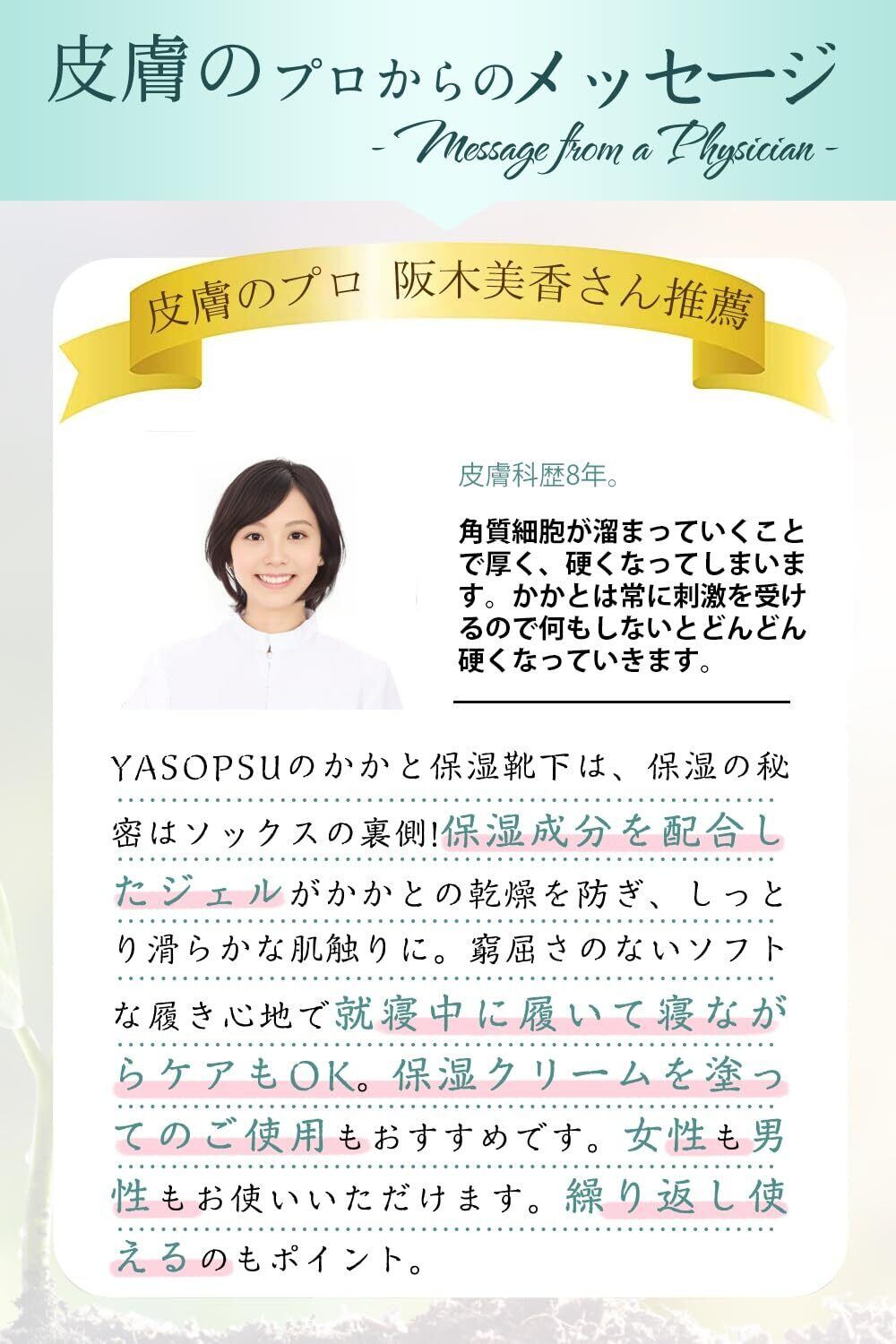 【皮膚のプロが推薦】YASOPSUのかかと保湿靴下は、保湿の秘密はソックスの裏側!保湿成分を配合したジェルがかかとの乾燥を防ぎ、しっとり滑らかな肌触りに。窮屈さのないソフトな履き心地で就寝中に履いて寝ながらケアもOK。保湿クリ一ムを塗ってのご使用もおすすめです。女性も男性もお使いいただけます。繰り返し使えるのもポイント。
