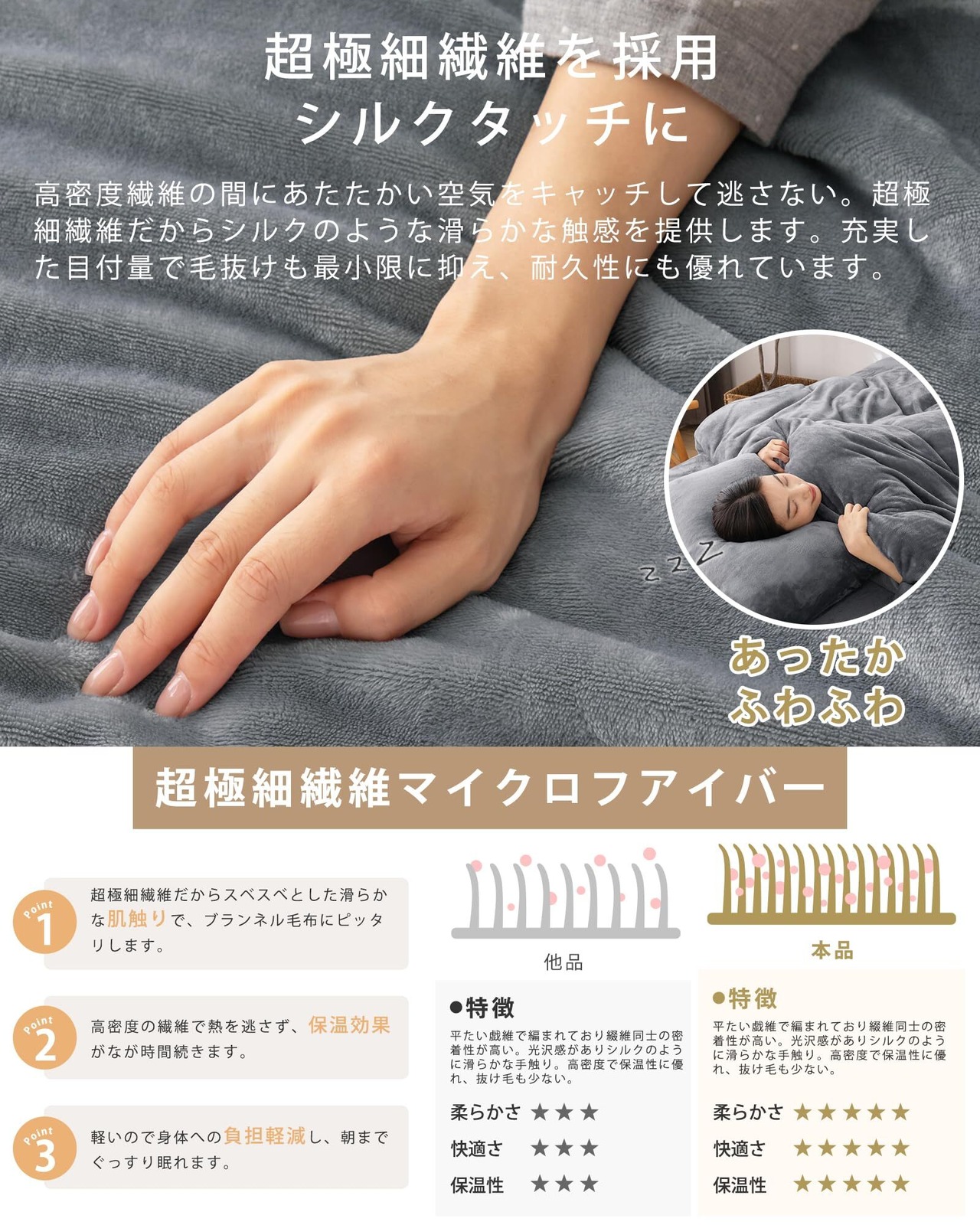 【吸湿発熱・シルキータッチ肌触り】毛布の表面は吸湿発熱素材を採用して、体から発散される汗や蒸気を吸収し発熱する「吸着熱」の原理を利用した素材です。体温を逃さずしっかり保あたたかさをキープしてくれます。さらに、シルキータッチ肌触りで、やわらかな感触が心地よい休息をサポートします。細い繊維の中にたくさんの空気を含めるので、保温力が高く暖かにご使用頂けます。首や肩口に当たる部分には、やわらかでボリュームのある衿を付けました。衿元からの冷たい空気の侵入を防いでくれるので、暖かさを逃しません。寒い季節でもべたつきを感じることなく、快適な睡眠を堪能できます。