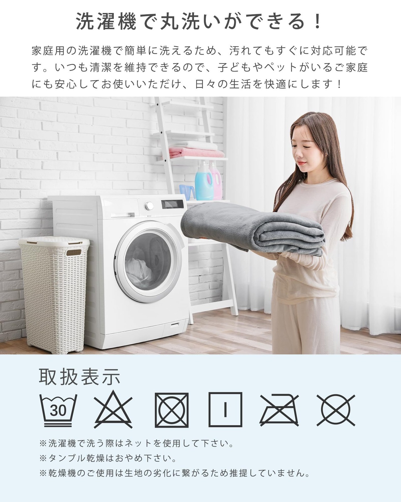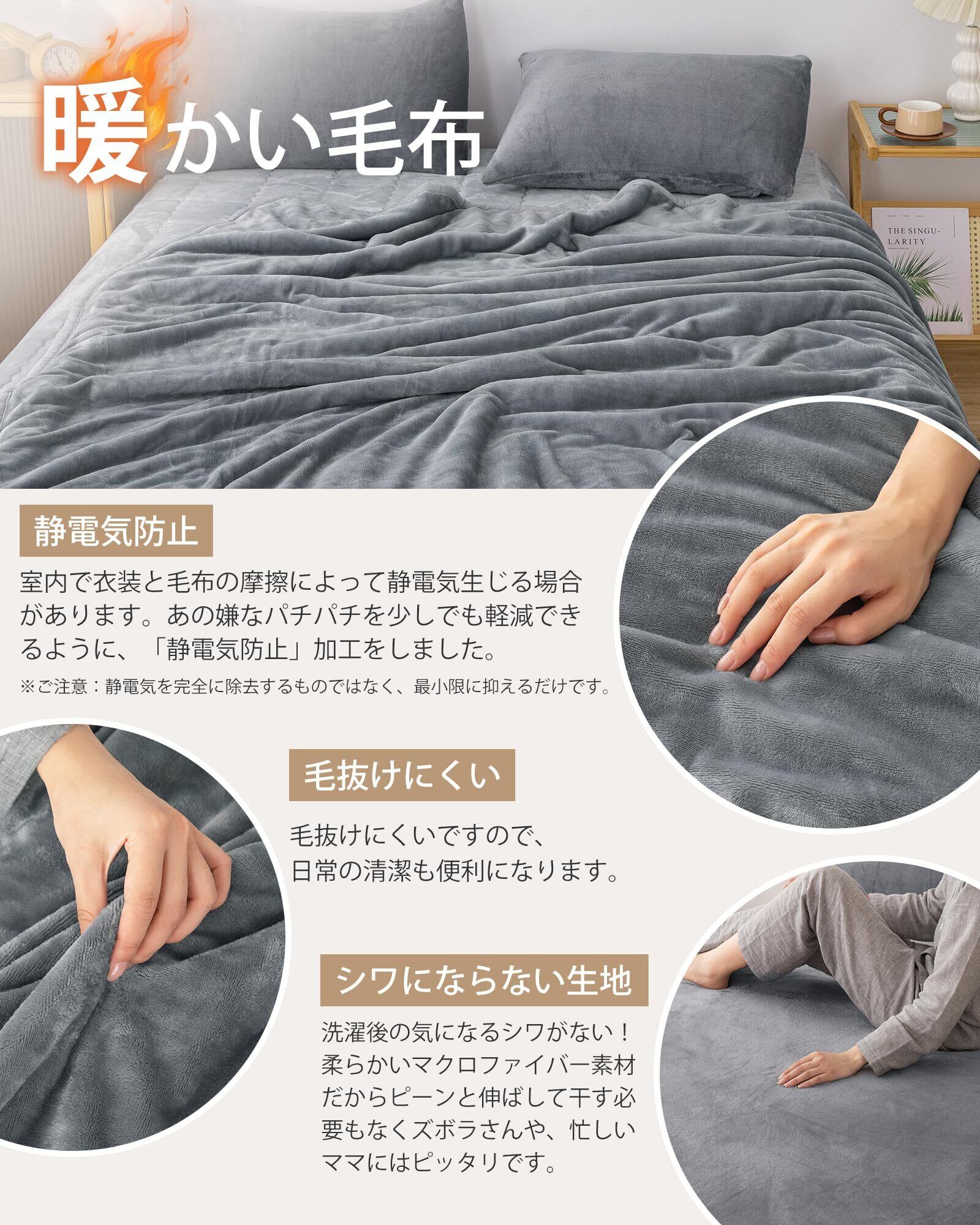 【抗菌防臭・静電気防止・丸洗いOK】健康的な環境を保つために、抗菌防臭機能が組み込まれています。さらに、静電気を防止することで、空気が乾燥する冬場のイヤな静電気を軽減して、快適な睡眠環境を提供します。そして、丸洗いが可能なので、清潔さを維持しやすく、いつも清々しい睡眠を楽しむことができます。起毛部分はほつれにくく抜けにくいので、耐洗濯性にも優れています。※静電気を完全に除去するものではありません。静電気を抑制する加工で快適に使用いただけます。