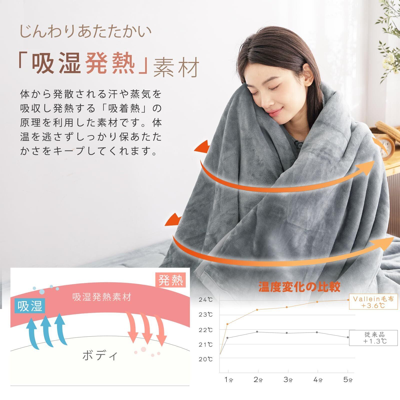 【マイクロファイバー素材を採用!!ぬくぬく暖かい毛布!】従来品を購入されましたお客様から「薄すぎ!、ぜんぜん温かくない」という貴重なご意見をいただき、Valleinは2023年最新毛布を開発しました。Valleinは超極細のマイクロファイバー繊維が身体を包み、朝まで続く暖かさを実現します。高密度で繊維がしっかりしているので、毛抜けも少ない。布団に入るときのヒヤっと冷たい感覚が苦手という方にはおすすめです!
