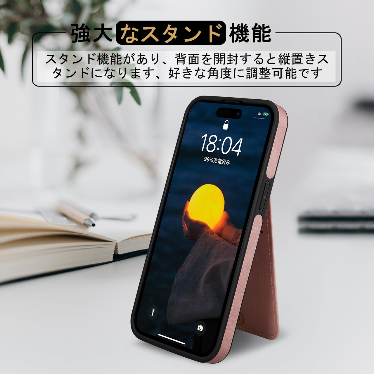 【多機能】❶収納機能:背面には4つのカード収納ポケットがあり、カード、名刺、定期券、免許証、写真などを収納できます。これにより、物を散らかすことなく、必要なアイテムを一括管理し、手軽に持ち運ぶことができます。マグネット式の開閉はしっかりとしており、収納物が落ちる心配もありません。このマグネット式の縦型開閉デザインのiPhone 15 Plus 用 ケースは、シンプルかつ便利で、コンパクトで美しい仕上がりです。❷スタンド機能:縦置きスタンド機能があり、背面を開けると縦置きできます。お客様はこの機能を利用して、ビデオ通話や動画再生、レシピ閲覧などのハンズフリー操作が可能です。画面の角度を微調整できるため、視聴姿勢に合わせて調節することも可能です。