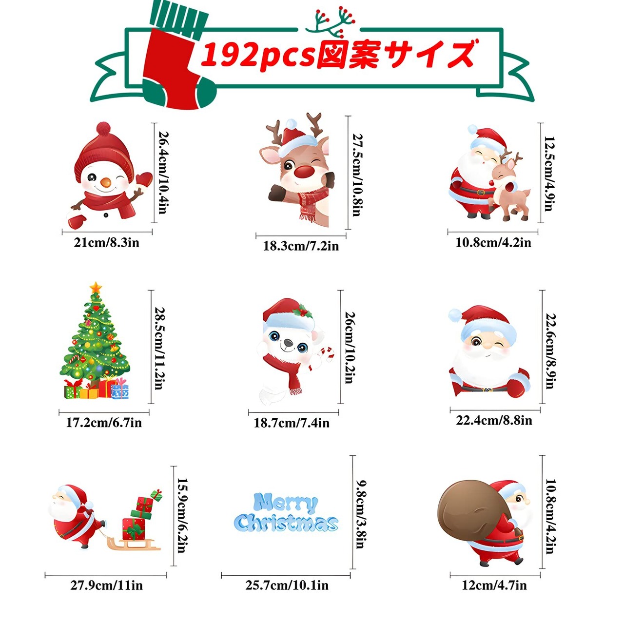 【商品仕様】:クリスマス静電ステッカー*9枚入り、192pcsシールを含まれています。サイズ:20*30cm;重量:150G。素材:PVC。
