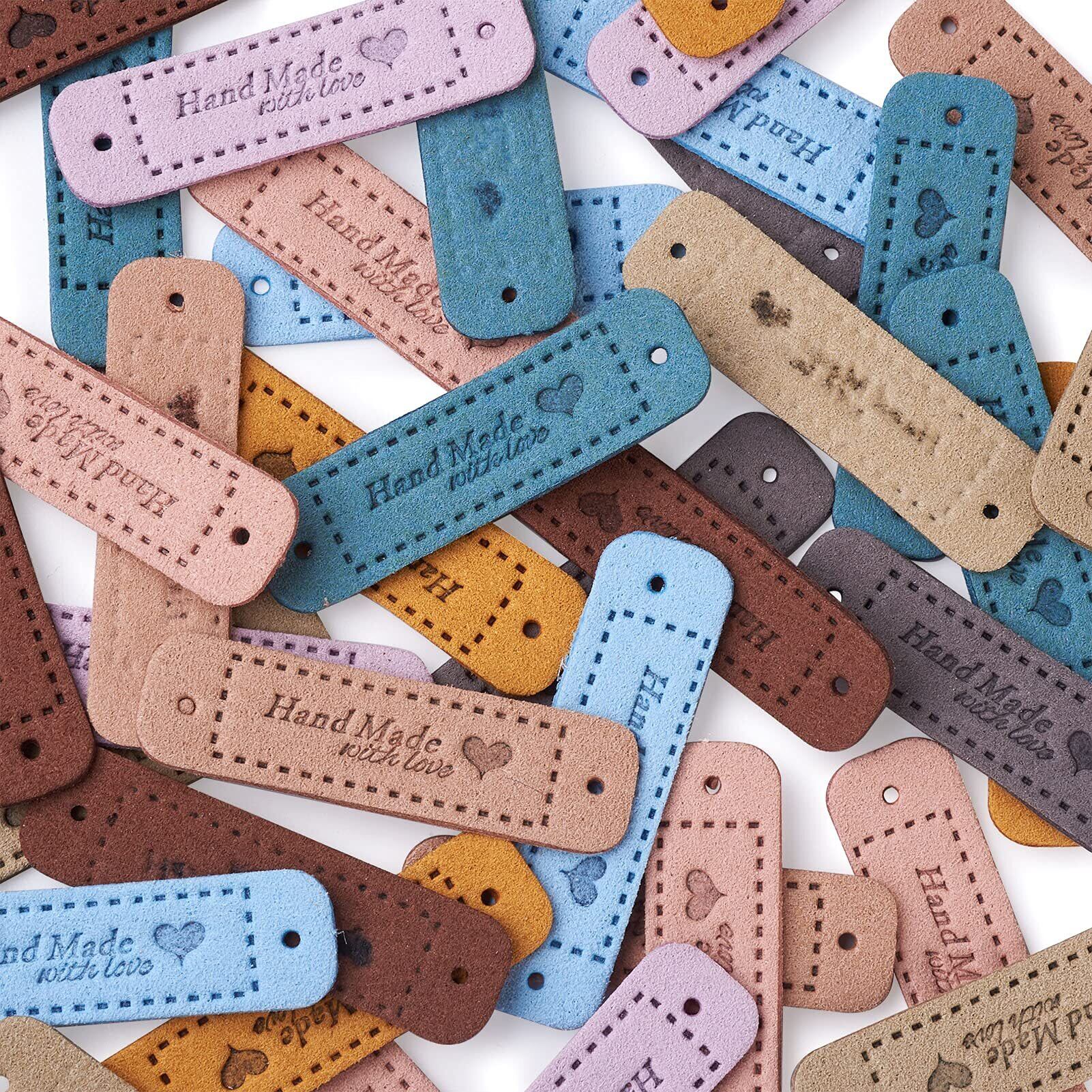 Beadthoven 54枚入り 9色 矩形 レザータグ 革ラベル 英文柄 穴開け タグ ラベル 縫製用 服 DIY アクセサリー 小物飾り 衣類装飾 ジーンズ バッグ 帽子 手作り ハンドメイド 手芸材料 55x15mm