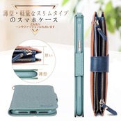 横置きスタンド機能が付いて、好きな角度で動画鑑賞や読書などを楽しめます。財布型ケースとして、内側には三つのカード入れとフリーポケットが付き、名刺や定期券など収納出来ます。