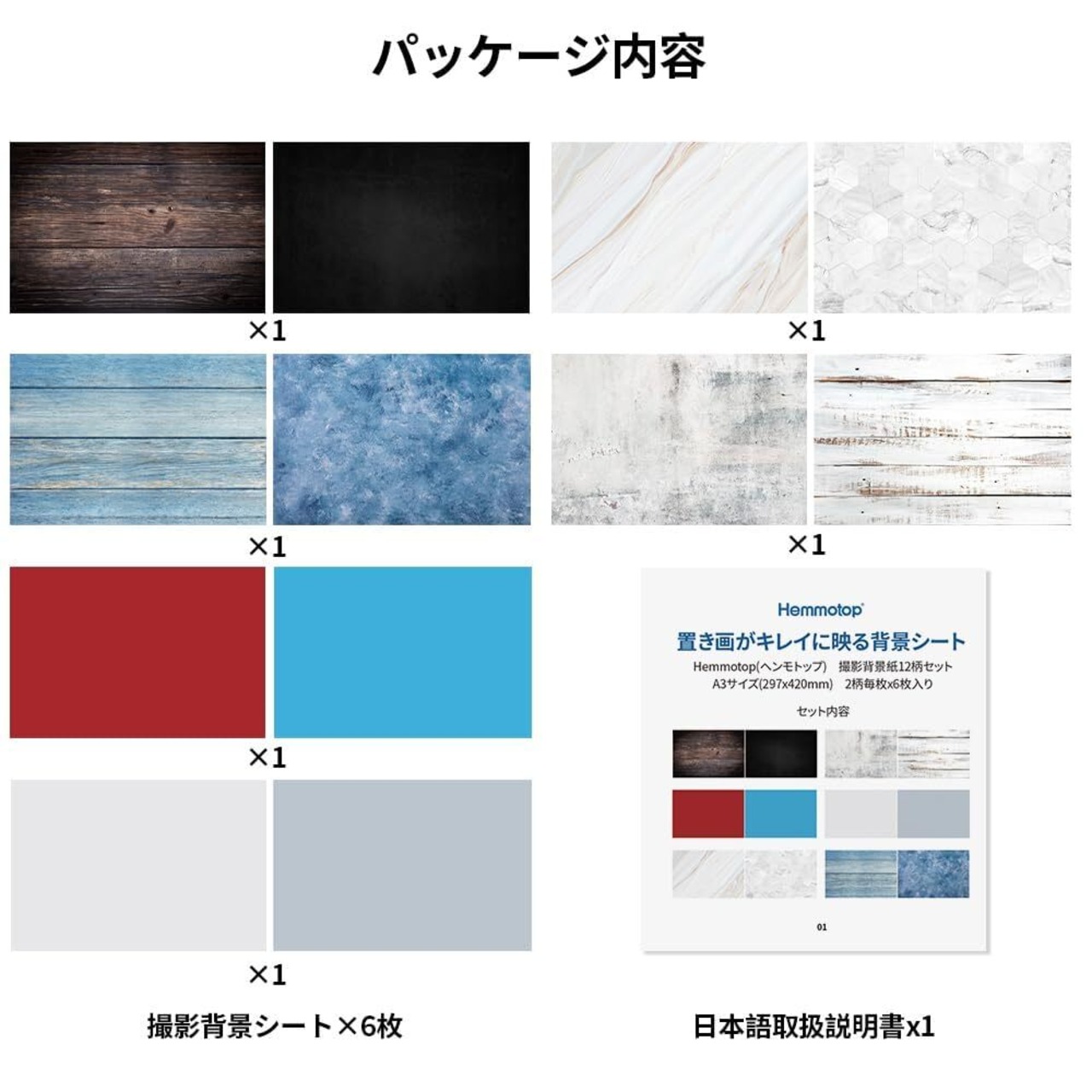 Hemmotop 撮影用背景シート 12柄 6枚 A3サイズ 背景紙 両面タイプ 木目/大理石/コンクリート/カラー柄 バックペーパー 小物撮影 商品撮影 雑誌 美食 アクセサリー撮影など適合 BZ01