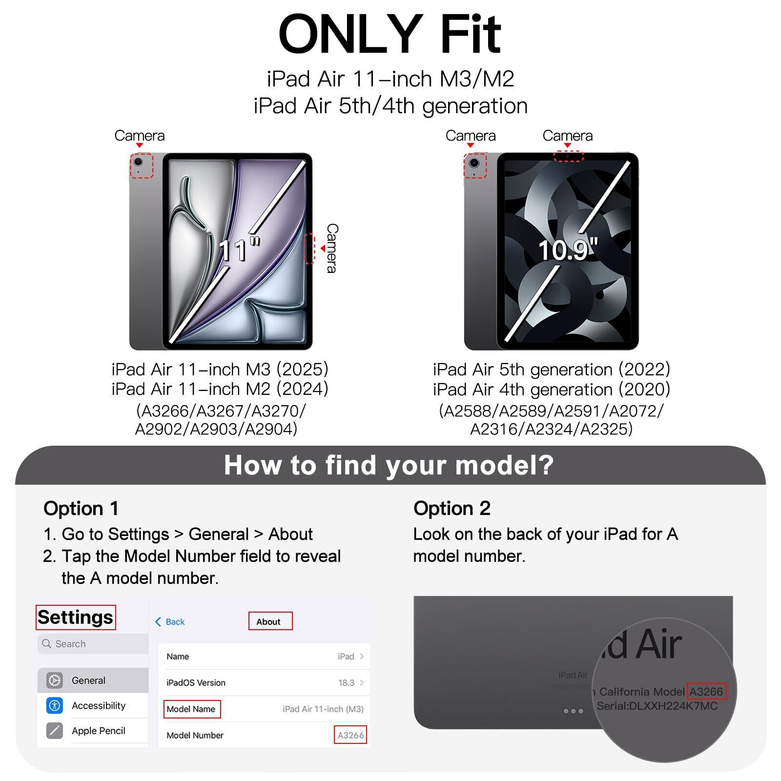[互換性] Pencil Pro/Pencil(USB-C)に対応。iPad Air 11 インチ M3/M2 (2025/2024), iPad Air5/4 (10.9インチ、2022/2020モデル、第5/4世代)用の特別デザインです。対応モデル:A3266 / A3267 / A3270 / A2902 / A2903 / A2904 / A2588 / A2589 / A2591 / A2324 / A2072 / A2316 / A2325。「設定」>「一般」>「情報」の順に選択します、「モデル番号」フィールドをタップしてAモデル番号を表示します