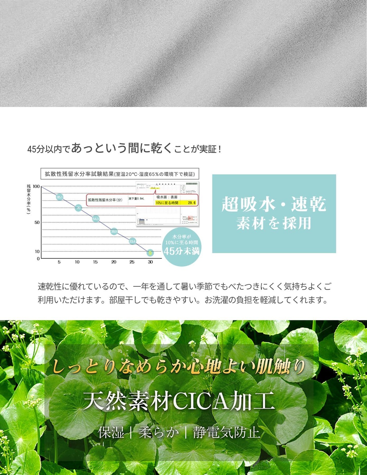 【CICA(ツボクサエキス)加工】 天然素材由来成分CICAによる柔軟加工を施すことにより、よりしっとりソフトな触り心地の良い風合いに仕上げました。同素材のボックスシーツも取り扱っています。お揃いで使えば、最上級の心地よさと眠りを。