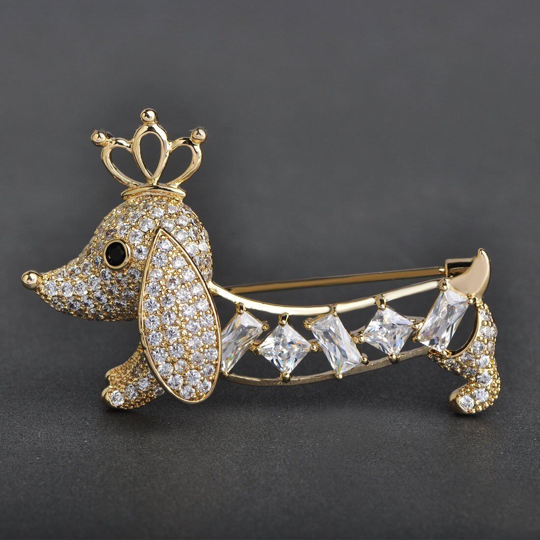 かわいい キラキラ クラウンをかぶる犬のブローチ ピン おしゃれ レデイース メンズ ピンバッジ 人気 コサージュ クリスタル ジルコン 上品 ゴールド 18k 金色 ダックスフント