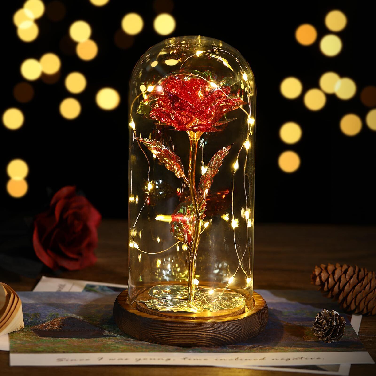 Lewondr バラ 造花 ガラスドーム 枯れない花 メッキローズ バレンタイン飾り 長持ち LEDライト付き 部屋飾り インテリア 引越しバラ/母の日/記念日/誕生日/入学/卒業/お祝い/お見舞い/お礼/彼女 クリスマス 飾り クリスマスライト ボックス付き 紅1輪