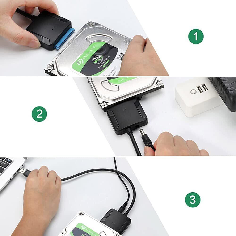 ご注意:(1) 本SATA変換ケーブルは、2.5インチと3.5インチのハードディスク/SSDのみ対応しており、5インチのHDDはサポートしていません。(2) 2.5インチのハードディスクを接続する際、外部電源は不要です。外部電源を使用すると故障のリスクがあります。3.5インチのハードディスクを接続する場合は、12V/2Aの電源アダプターを別途使用してください。電源アダプターのプラグサイズは5.5*2.1MMです。12Vを超える電源アダプターを使用すると、ハードディスクが故障する可能性があります。(3)PCに接続する前に、USBポートが正常に使用できるか確認してください。破損している場合、どのHDDを接続しても認識されません。(4)USBポートの接触が悪い場合、認識されない、または認識後にデータ転送速度が非常に遅くなることがあります。(5)プラグサイズが5.5*2.1mmの電源アダプターを使用してください。他のサイズを使用すると、電源ポートに挿せないか、ピンが曲がって破損する可能性があります。