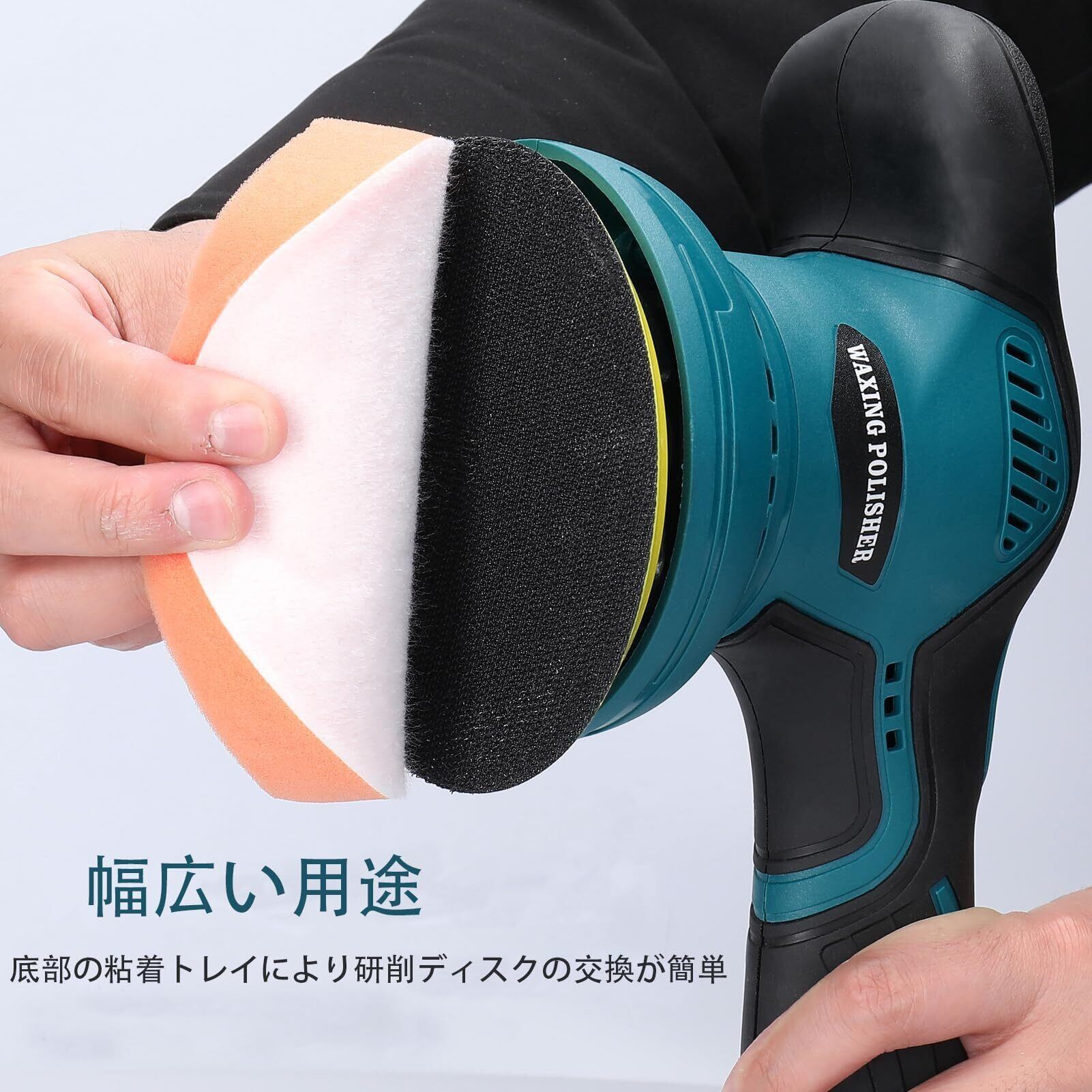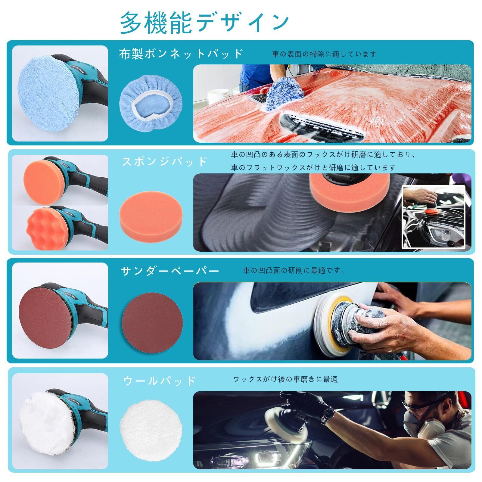 【18豊富なバフセット・取り付けが簡単】 パッドの裏はマジックテープ式で、効率的にバフを切り替えできます。2 * フラットスポンジディスク、2 *ウェーブスポンジディスク、1 *ウールディスク、5 *サンドペーパー、2 * ブルーワックスカバー、2 * ホワイトワックスカバー、2 *ウールカバー、全体的には6種類を用意させます。1 *交換用バッテリー1 * バッテリーアダプター。車の研磨やワックスに使用する他に床、ソファー、バスタブなど、きれいな表面を艶出せる際にはきっとお役に立つと存じます。