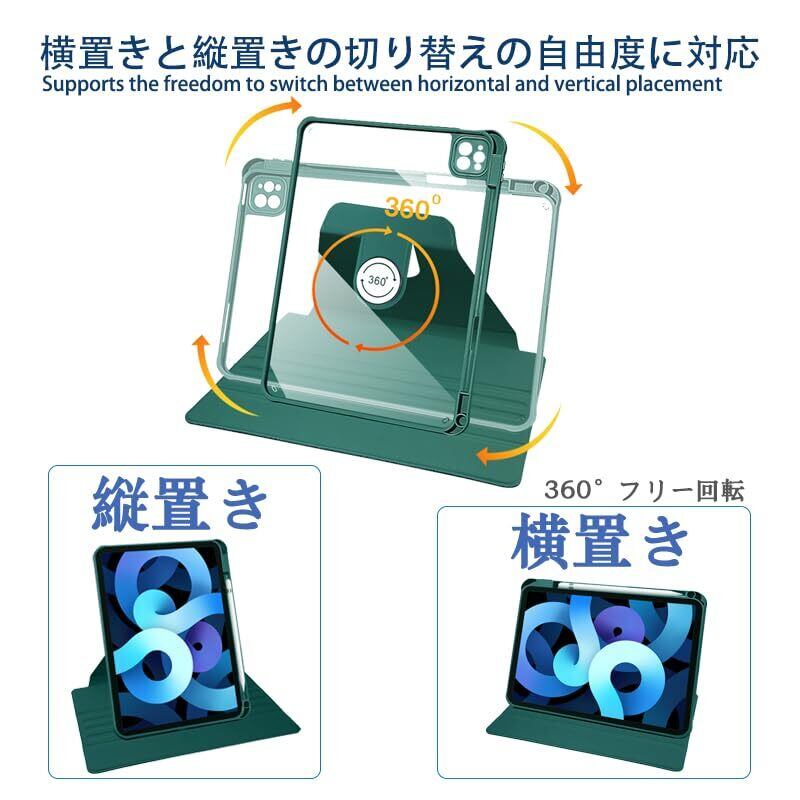 iPad Pro 11 ケース 2023/2022/2021/2020/2018 モデル兼用 PUレザー 360度回転式 磁気吸着 iPad Air 第5 / 4 世代 ケース 透明カバー スタンド 調節可能ハンドバンド ペン収納 軽量 便利 Apple Pencil 収納 耐衝撃 iPad Pro 11 インチの iPad Air 第五 四 世代 兼用 カバー ダークグリーン