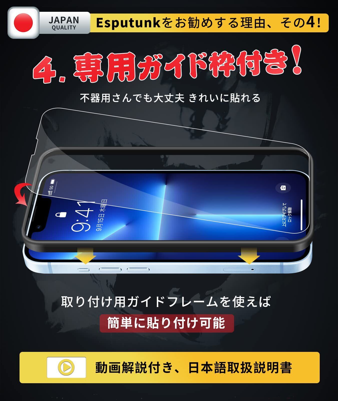 ※必ずお読みください※「注意喚起」本製品は13Pro対応ガラスフィルム+カメラフィルム+ガイド枠4枚セットです。全面保護を提供いただき、別に買うために行く必要はございません。ご希望の数は在庫数上の場合はどうぞ弊店にてお問い合わせください。【Esputunk製品保証の概要】:永久保証について、製品に不具合が生じた場合は、お客様からのお問い合わせ内容に応じて代替品交換・返金対応を提供致します。(お一人様につき1回限り)