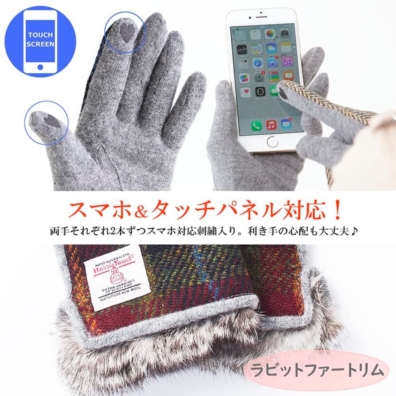 [7th Heaven] 【ハリスツイード】HARRIS TWEED レディース スマホ対応 ラビットファー付 手袋 ジャージーニット AY-15AWGL-005