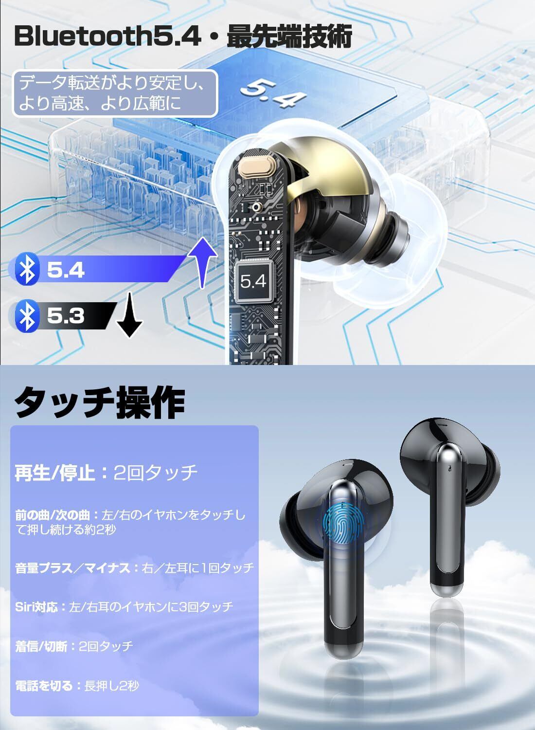 【瞬時接続・自動ペアリング・誤操作を減らす・Bluetooth5.4】蓋を開けたら接続、遅延なし、中断なし、ケースから取り出すだけで瞬時に接続できる自動ペアリング機能を備えています。タッチ操作がストレスなく行え、簡単なタッチコントロールでで曲送り/曲戻し、音楽再生/停止、電話応答/終了/拒否、電源オン/オフ、音量調整、など基本的な操作が実現です。Bluetooth 5.3よりも安定したBluetooth 5.4テクノロジーを搭載し、障害物なしで最大10メートルまで伝送できます。さらに、信号なし、音飛び、音割れ、音に遅延などの状況を大幅に改善できて安定性は抜群です。ゲームをしても、通話しても、映画を見ても非同期になることはありません。