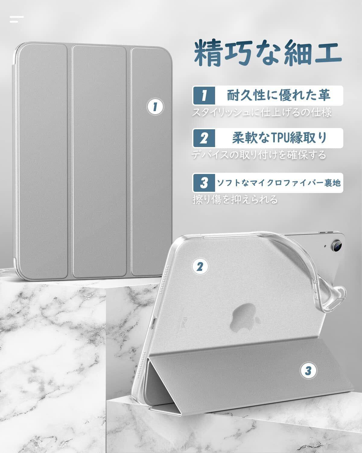 「上質素材採用」 耐久性に優れた高級PUレザーで仕上げられて、内部材質はマイクロファイバー製で、摩擦により発生する擦り傷を抑えられます。iPadをしっかりと保護できます。