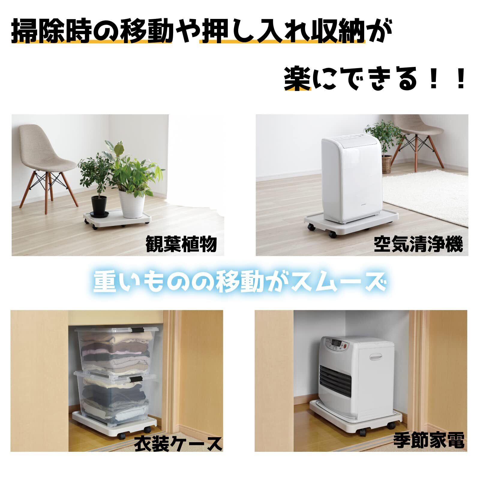 【重たい物もおまかせ】耐荷重50kgなので、重い水のストックや家電、観葉植物や押し入れの収納など、重くて動かし辛いものを載せておけば、スムーズに動かすことができるようになります。