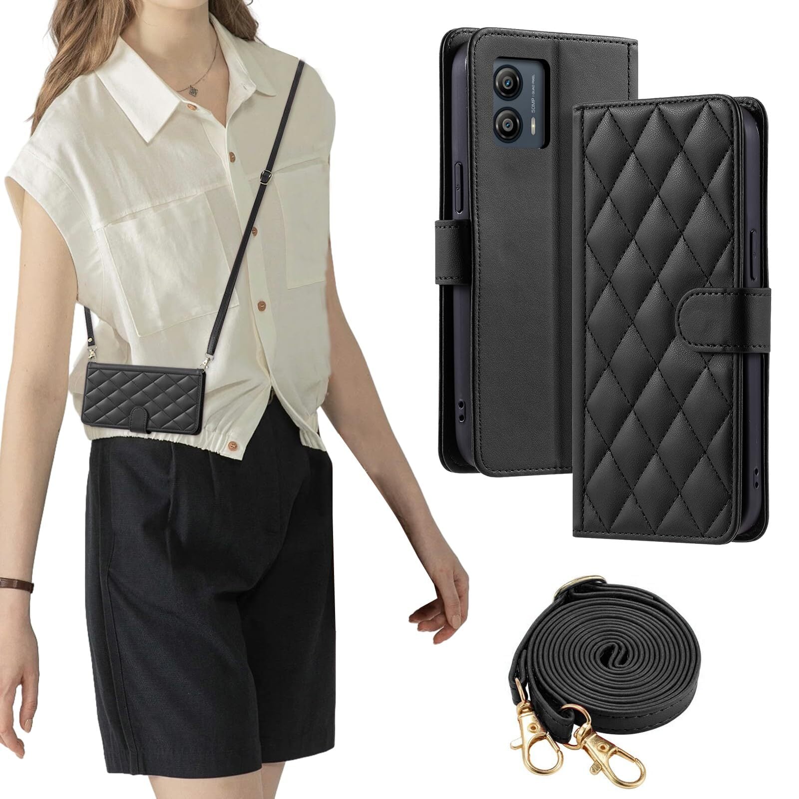 FOR moto g53y 5g/moto g53j 5g/moto g13 moto g13 ケース 手帳型 おしゃれ ストラップ付き スタンド機能 カード収納 軽量 薄型 耐衝撃 高級PUレザー 滑り防止 財布型 内蔵マグネット 開閉式 チェック柄 上質 耐摩擦 マグネット式 肩掛け 斜め掛けーブラック