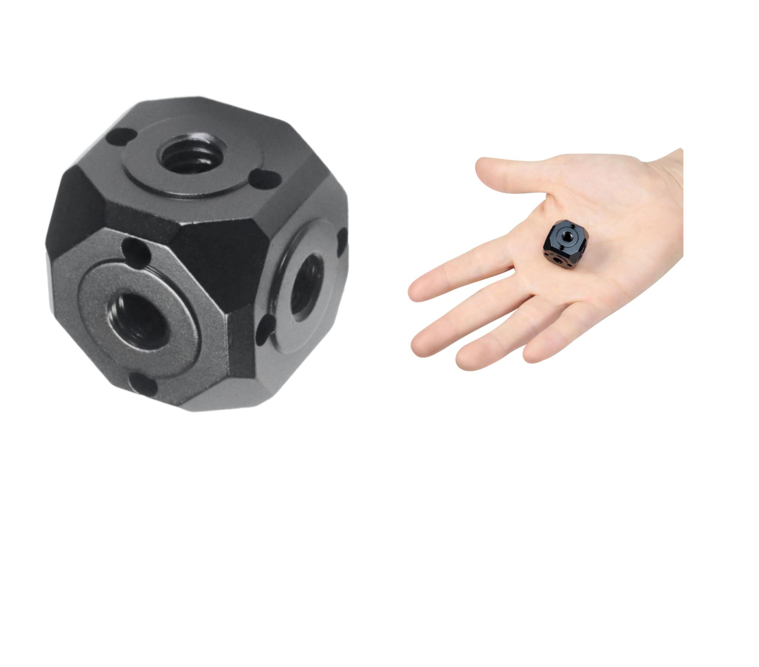 【6面 マルチフェイス 拡張 アダプター】キューブ状の全面ジョイント機能を備えた立方体のネジアダプターです。1/4"および3/8"インターフェイス接続に対応します。サイコロの様な形状で、6面のすべてにネジ穴があり、三脚や一脚、ボールヘッド・自由雲台、セルカ棒(自撮り棒)ハンドヘルド 三軸ジンバル、スタビライザー 撮影グリップ、撮影スタンド等へのマウント、及びアーム付きマジックアームやダブルボールヘッド雲台、ダブルスタッドネジ等を介してマイク、撮影用LEDライト、スマホホルダー(スマートフォン)、GoPro、SJCamo、DJI Osmo Action, Muson, Akaso, Insta360, Surfola,等ウェアラブルカメラの搭載などに対応します。1/4インチネジ1本とARRI規格対応小ネジ4本が付属しており、ネジをしっかりと固定して、装置の反転や緩みなどの問題を効果的に防止できます。