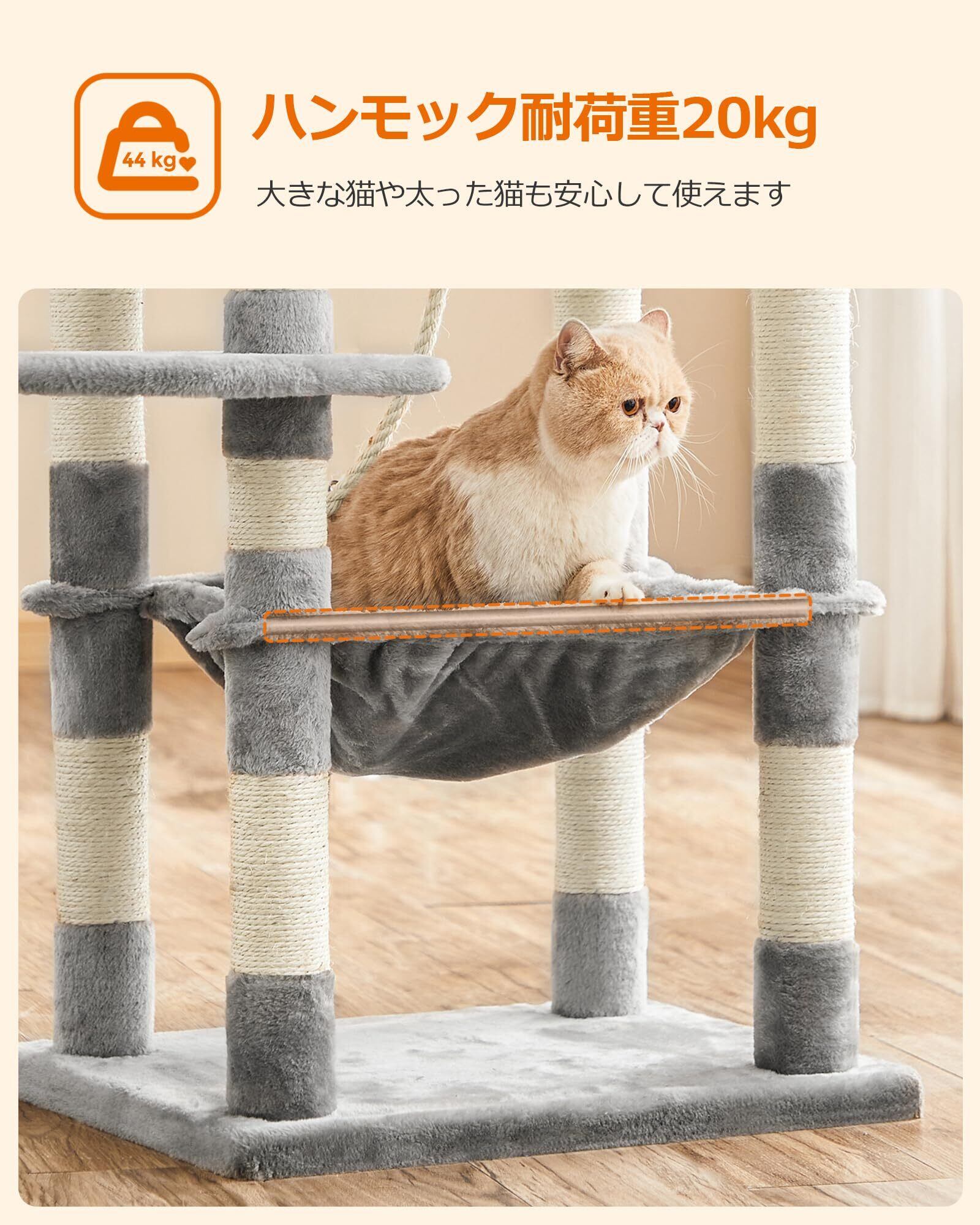 FEANDREA キャットタワー 大型猫用 猫タワー 多頭飼い 人気 ハンモック耐荷重20kg 爪とぎ 登りやすい ボンボン 天然麻紐 据え置き 運動不足解消 安定性 高さ143CM PCT15WV1
