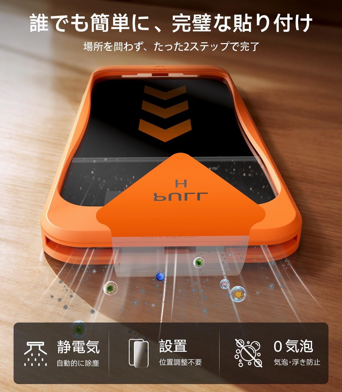 【Just One Pull・貼り付け成功率100%=0気泡+0埃+0ズレ】 革新的な Just One Pull ガイド枠を標準装備しており、フィルムの貼り付けをこれまでにないほど簡単にする。枠を画面に嵌め、ハンドルを引く(Just One Pull)だけで貼り付けが完了した。更に、静電気を利用した除塵システムにより、埃や気泡がガラスフィルムの裏面に付着するのを防ぎ、場所問わず、誰でも完璧に貼れる。貼り付け後の画面はまるで貼っていないかのようにクリアで、美しい仕上がりを実現する。 ※Just One Pull枠は2020年に市場初登場し、現在は第5世代の製品である。業界一番上の便利さと簡単操作、成功率の高い画期的な貼り付けソリューションである。