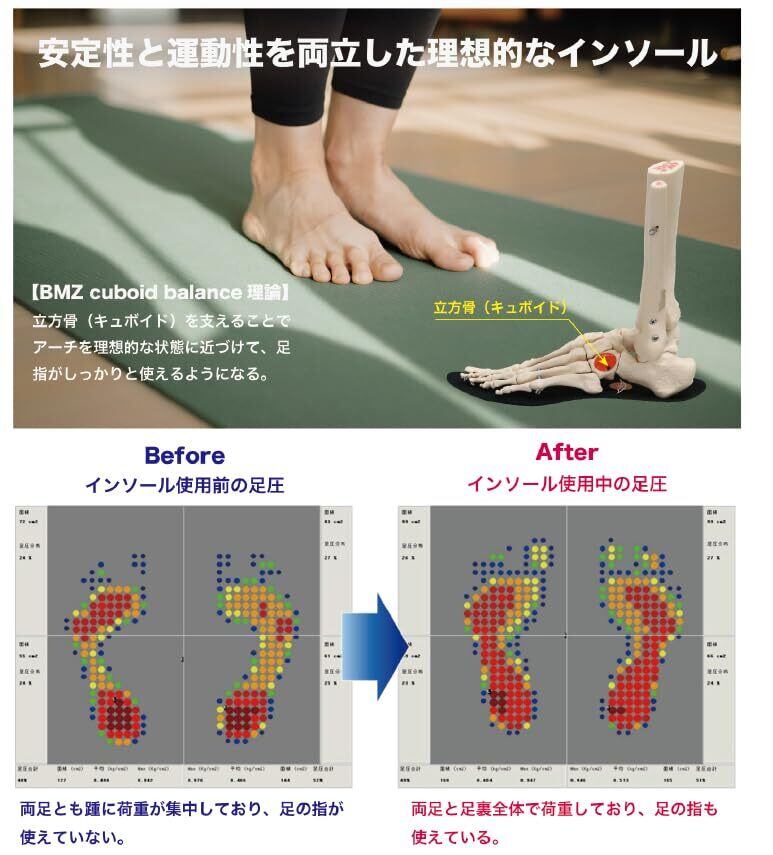 土踏まずを支えるだけのアーチサポートインソールとは違い、キュボイドバランス理論は足の立方骨を支えることによって立方骨中心に足の骨格バランスをサポートし、足の動きを制限することなく「安定性」と「運動性」を両立