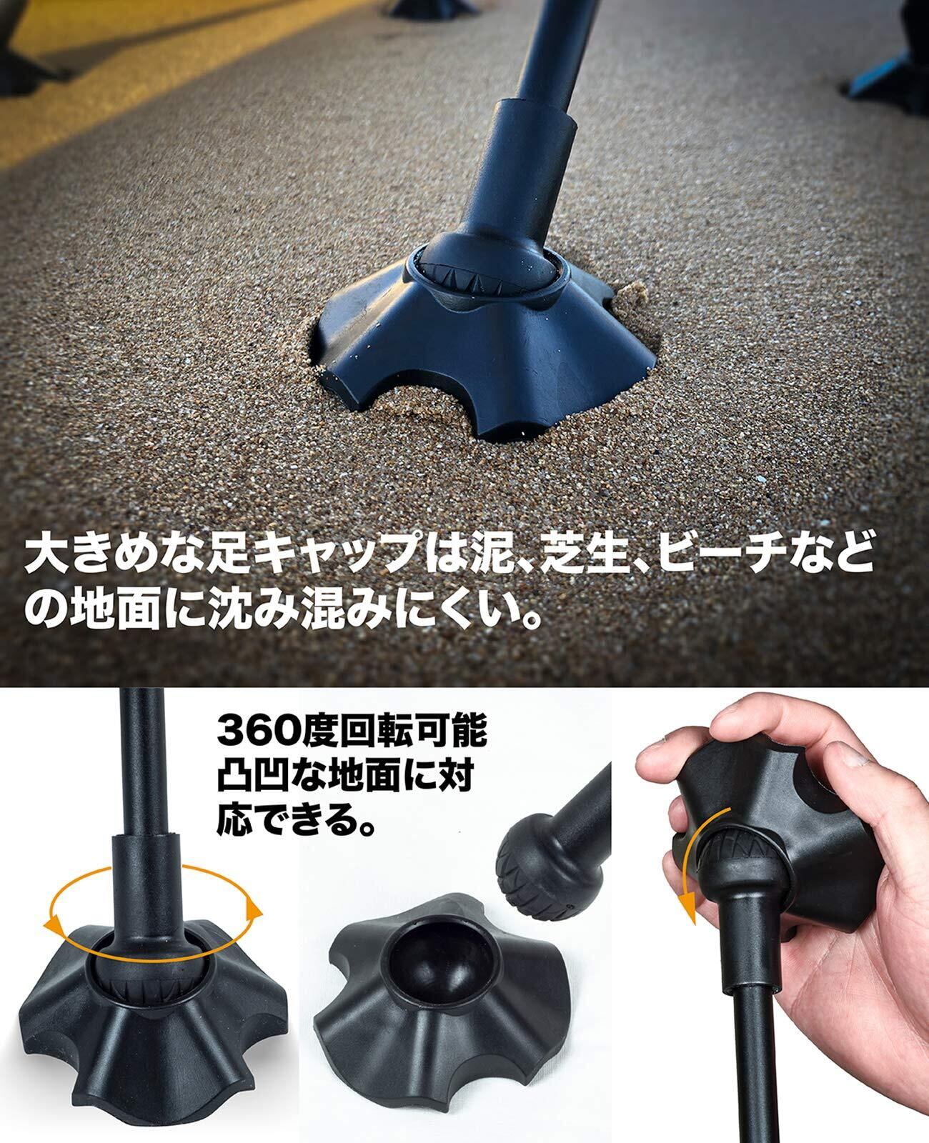 大き目な脚キャップ付き:ビーチや柔らかい地面に沈み込み防止です。脚キャップは自由に回転でき、山道などで休憩に最適です。肩もたれのウェビングで補強し、より快適使用出来ます。