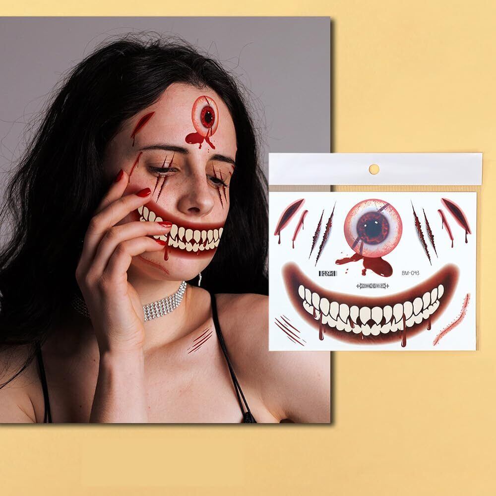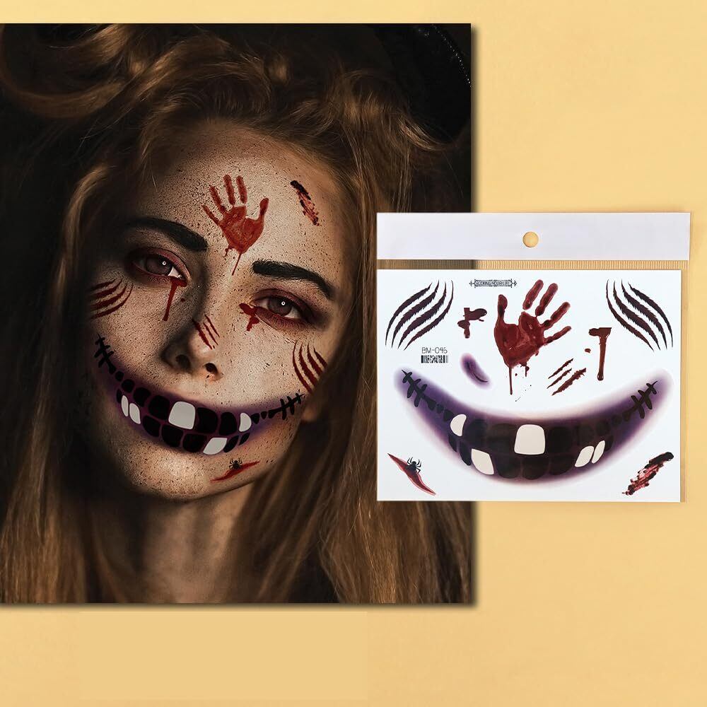 FINGOOO ハロウィン タトゥーシール フェイス 顔全体 6枚セット 刺青 テッカー シール かわいい 傷 小物 仮装 メイク 縫い傷 爪裂き 傷跡 (A)