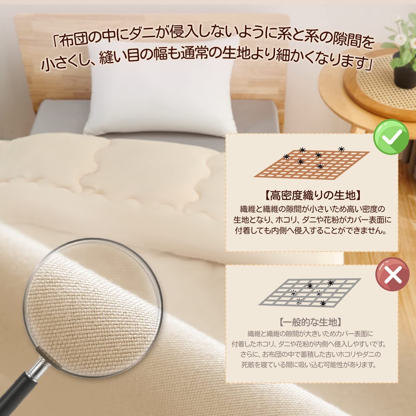 【抗菌防ダニ加工】詰め物に抗菌防臭加工のおかげて、湿気や汗でジメジメする季節には、細菌の増殖(ダニ、カビ等)、汗や皮脂のニオイを抑制するので清潔感を保ち快適に過ごせます。布団の中にダニが侵入しないように糸と糸の隙間を小さく縫い目の幅も通常の生地より細かくなります。