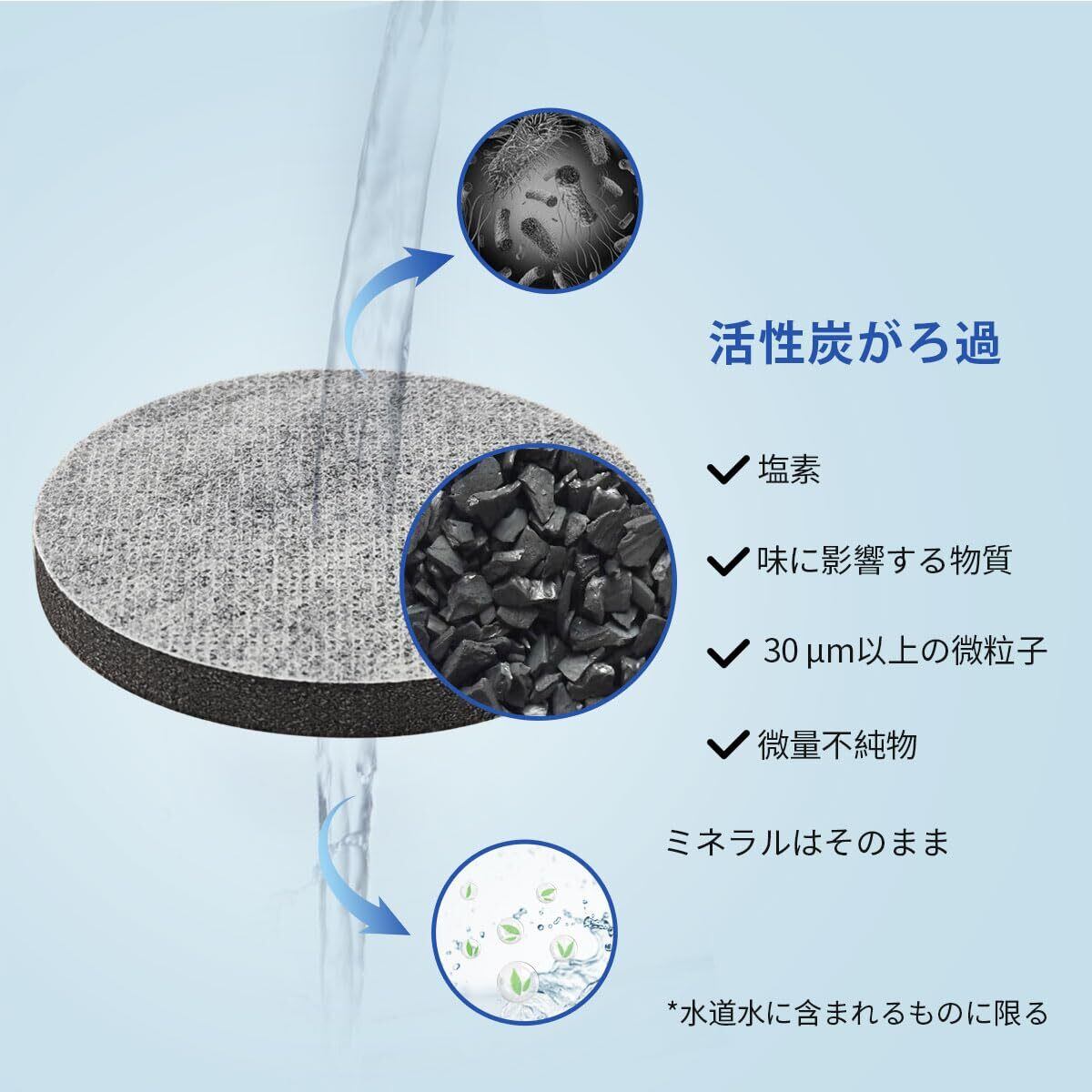 【安心の材質】新鮮でおいしい水をヤシ殻から製造された天然活性炭が以下をろ過します:√塩素および味に影響するその他の物質。√殺虫剤、除草剤、環境ホルモンなどの微量不純物。√30um以上の微粒子。